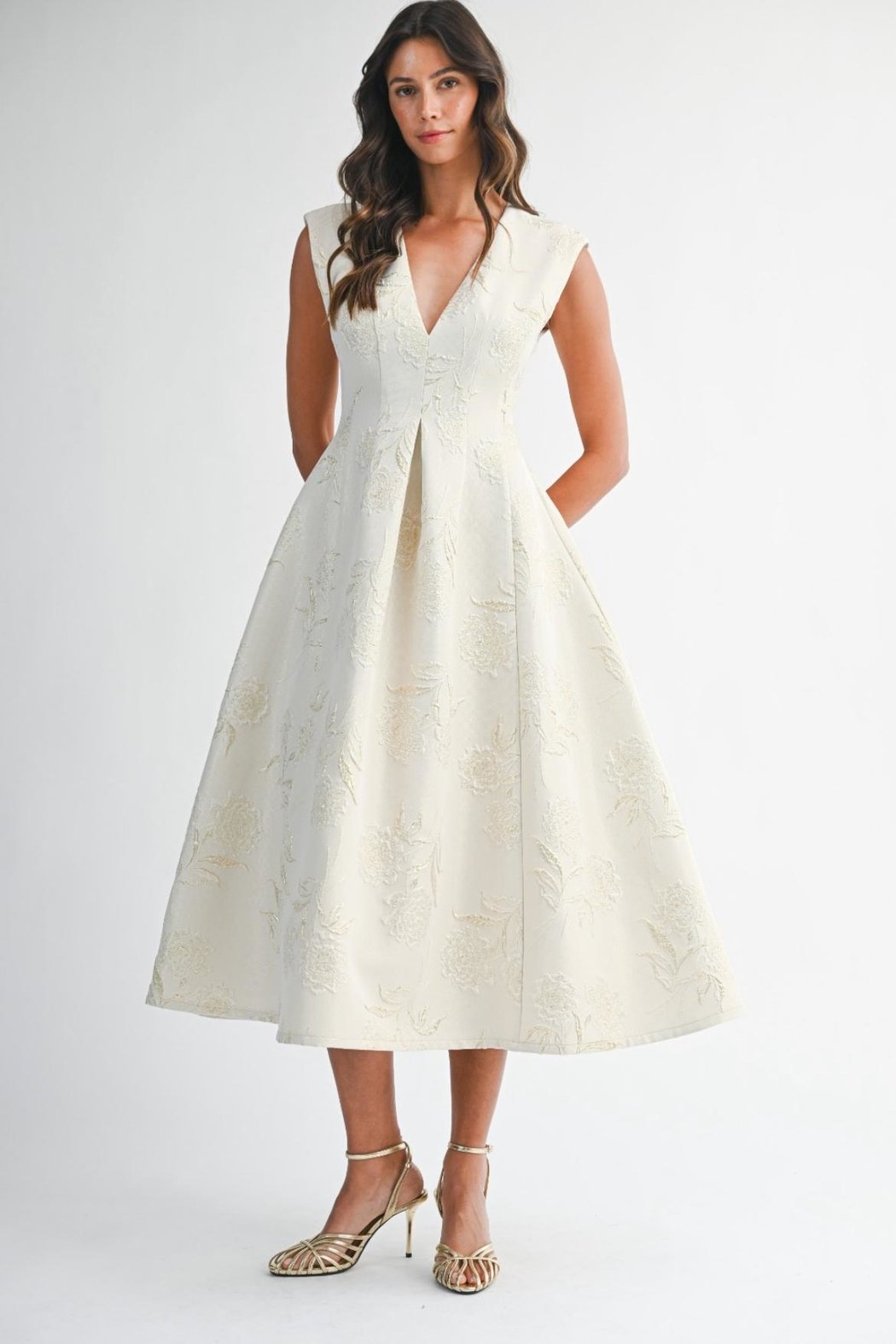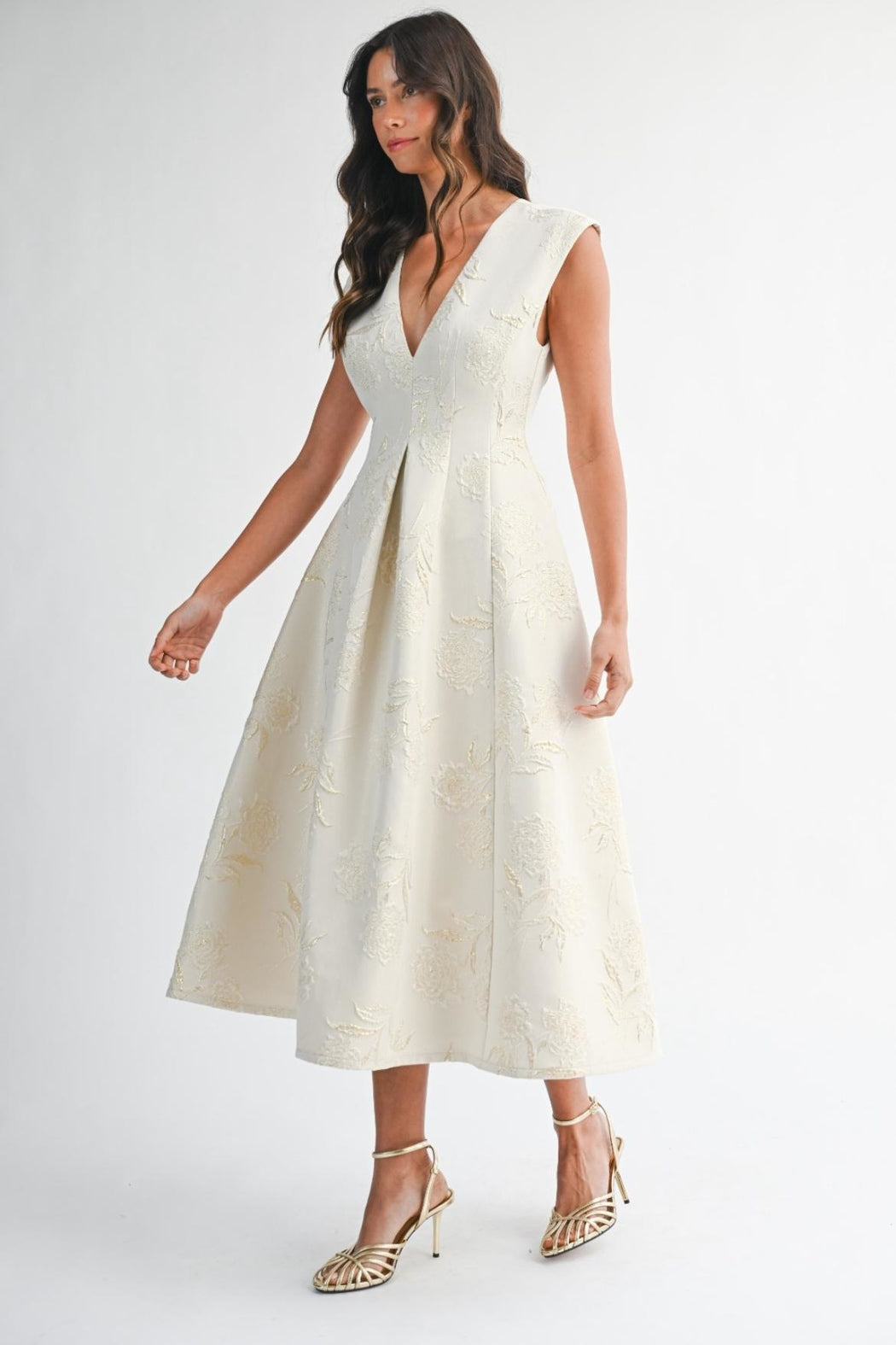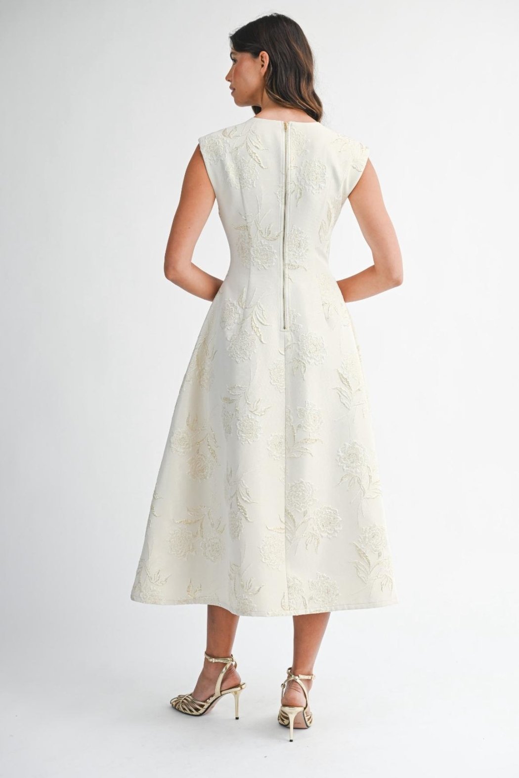 Floral jacquard flare midi dress. Model is wearing a size Small