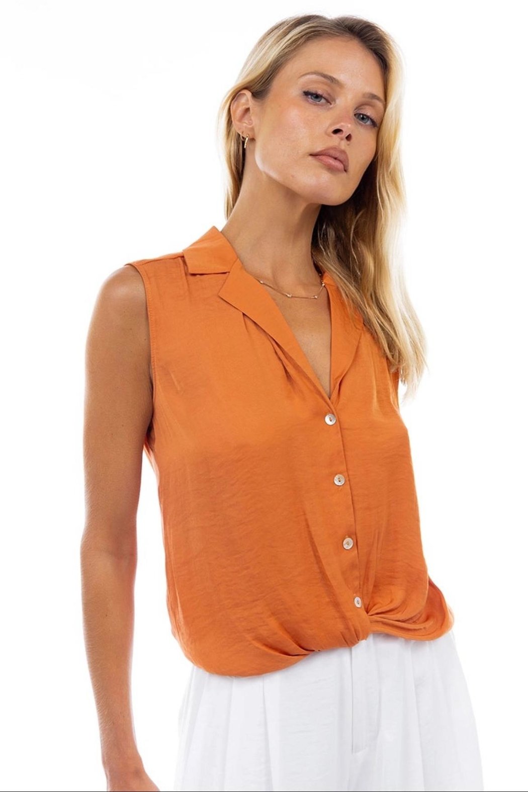 Knotted sleeveless button down collared top. Model is wearing a size Small