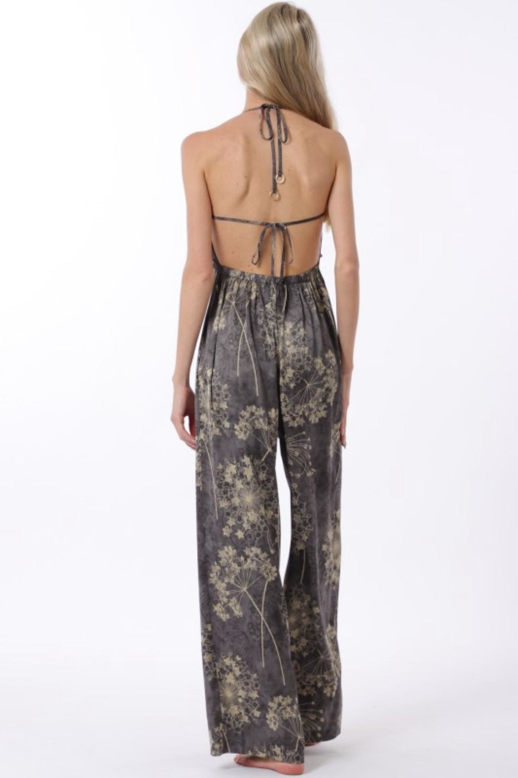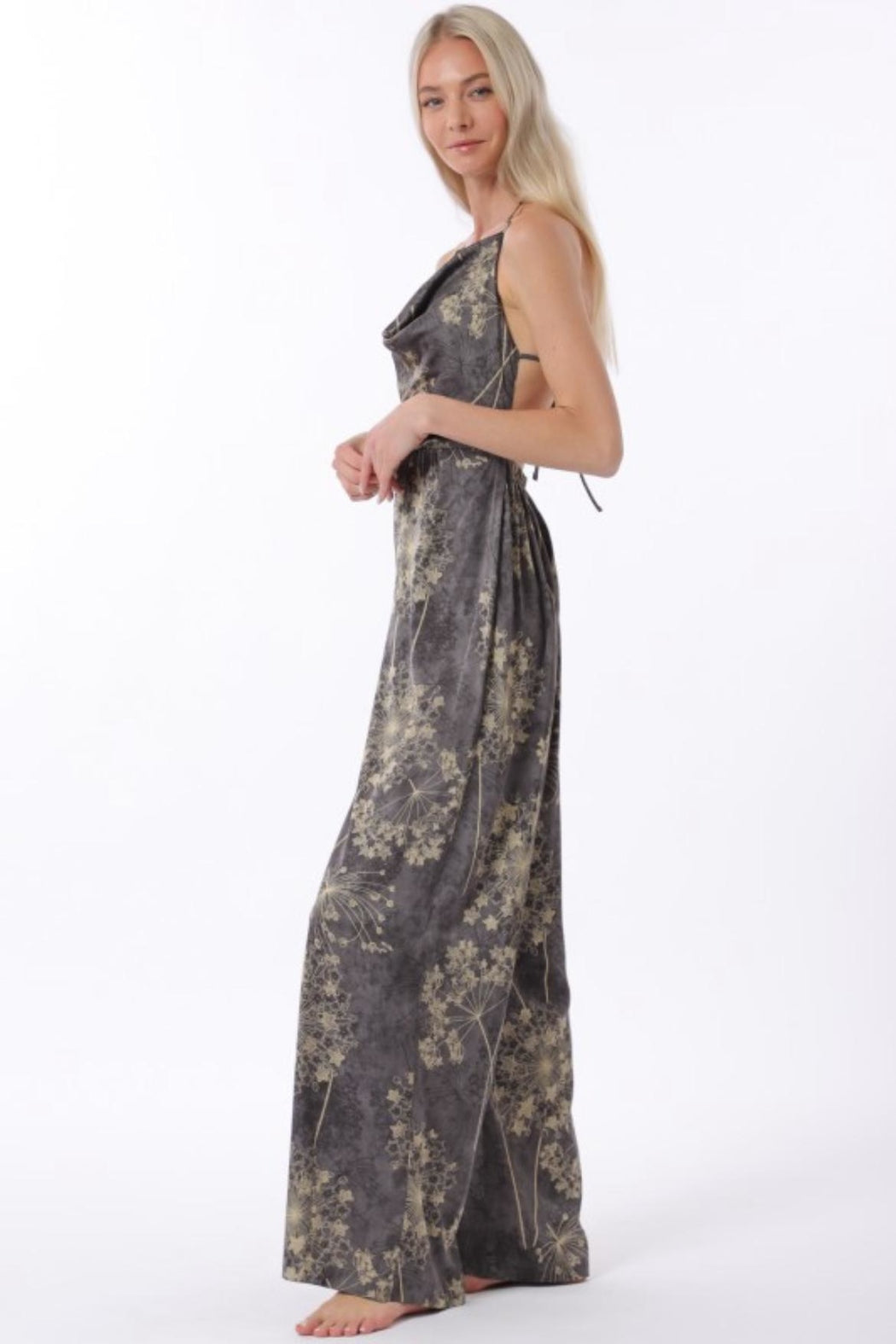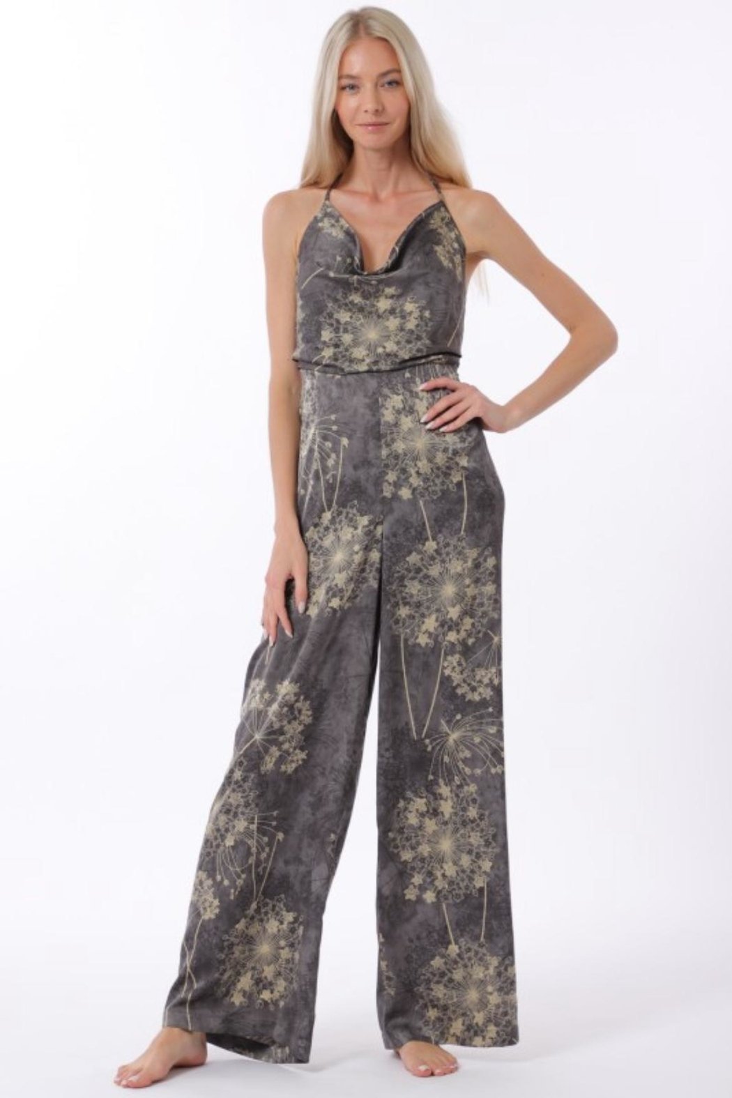 Leaf print cowl neck elastic back halter jumpsuit. Model is wearing a size Small