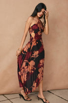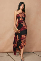 Floral one shoulder asymmetrical pleated side cut-out dress. Model is wearing a size Small