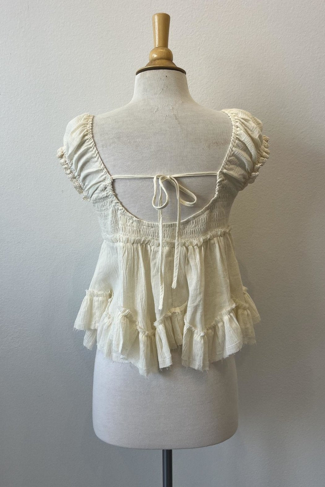 Pintuck cap sleeve babydoll top with lace detail. Mannequin is wearing a size Small