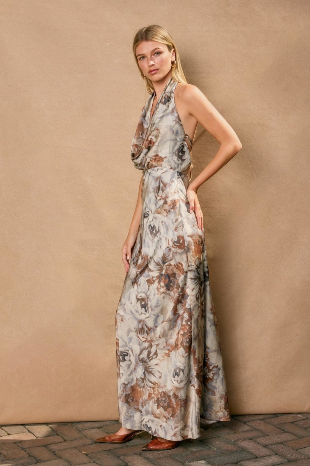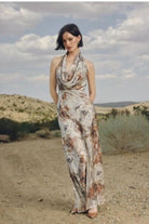 Floral cowl neck halter dress with lace up back. Model is wearing a size Small