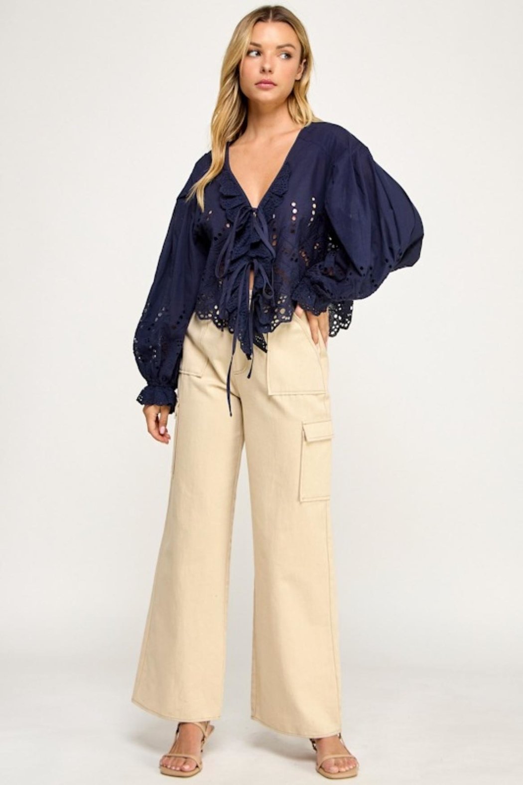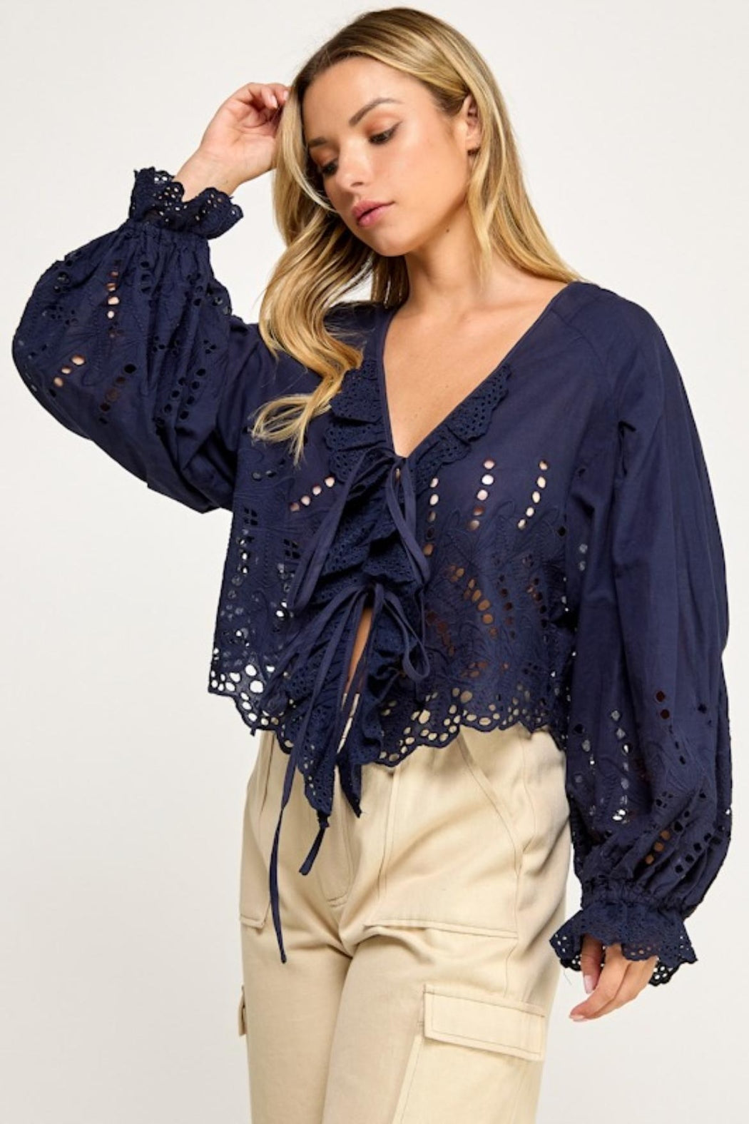 Scalloped hem eyelet detail long sleeve blouse. Model is wearing a size Small
