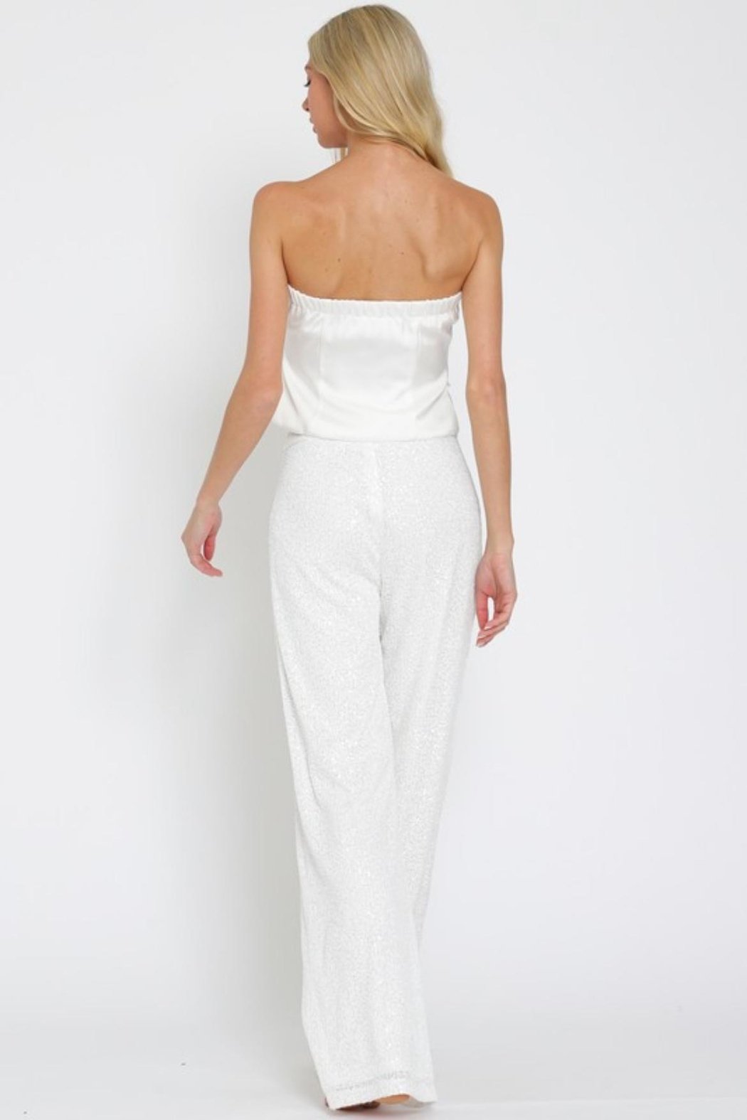 Tube vest and high waisted sequin pants set. Model is wearing a size Small