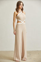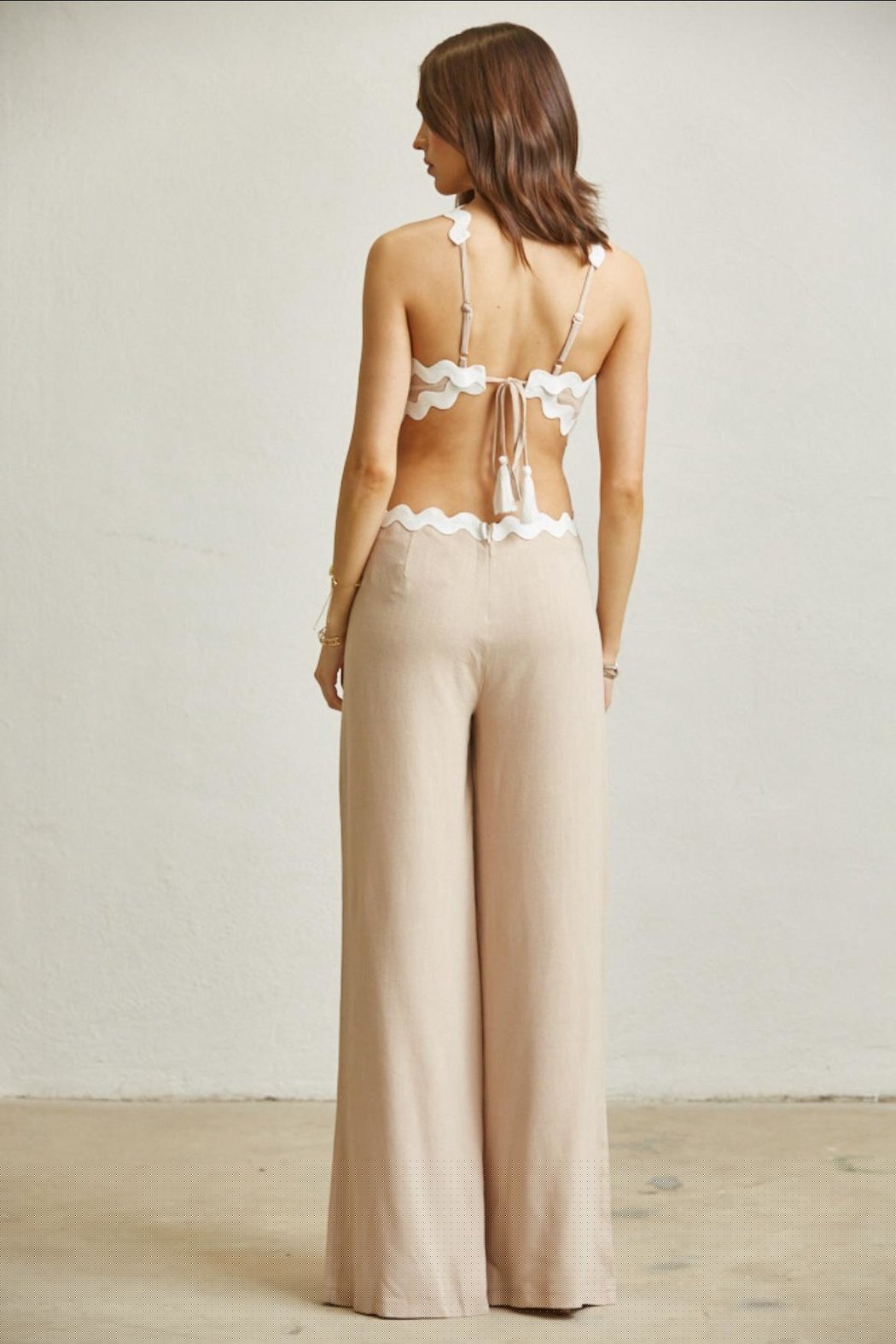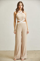 Linen blend crossover front side cut-out jumpsuit. Model is wearing a size Small