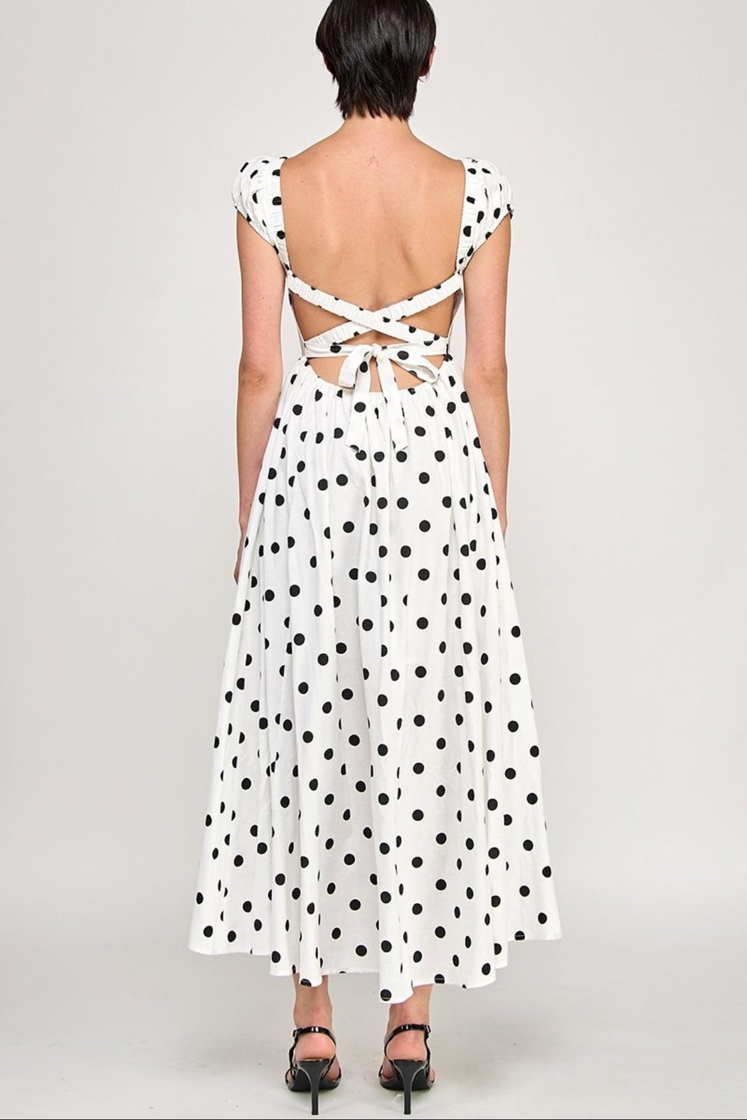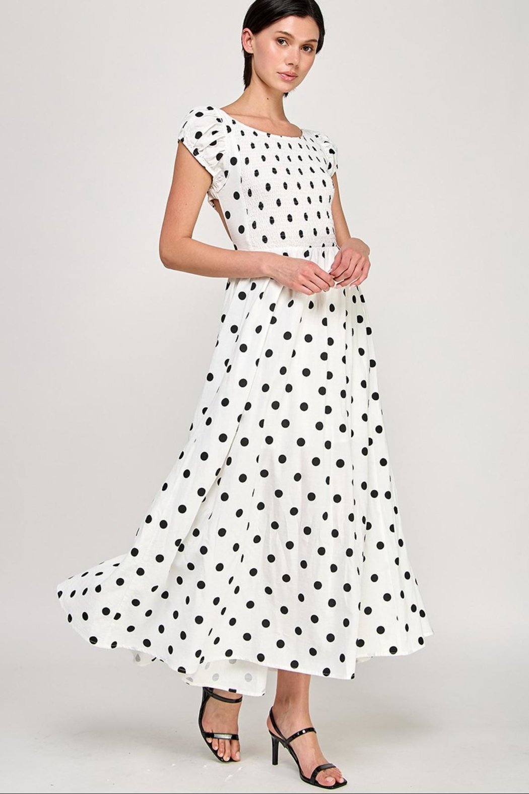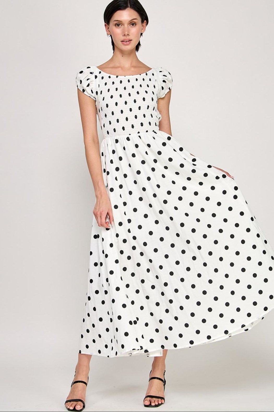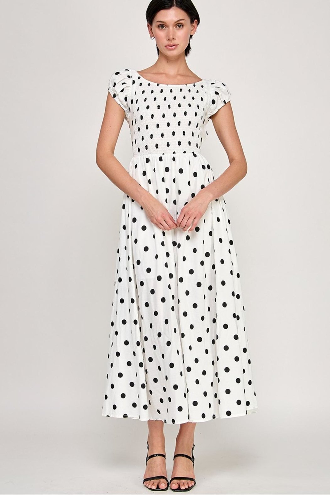 Smocked bust bubble cap sleeve polkadot dress with pockets. Model is wearing a size Small