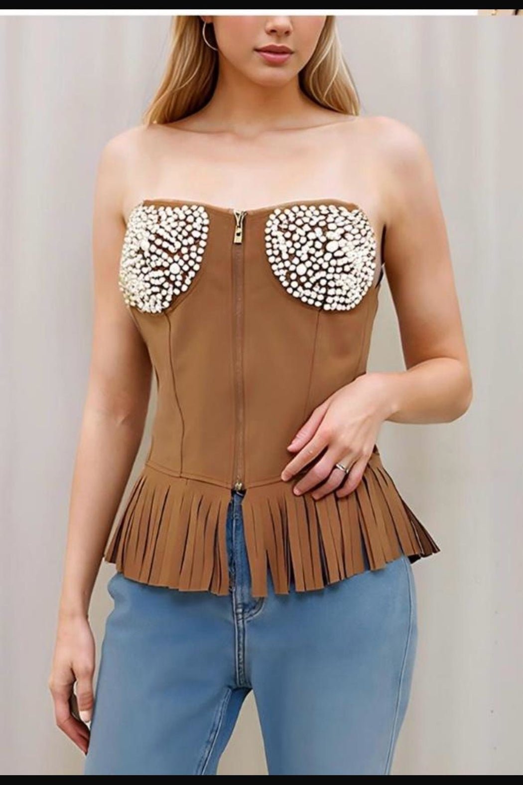 Strapless suede top with pearls and fringe hem. Model is wearing a size S/M