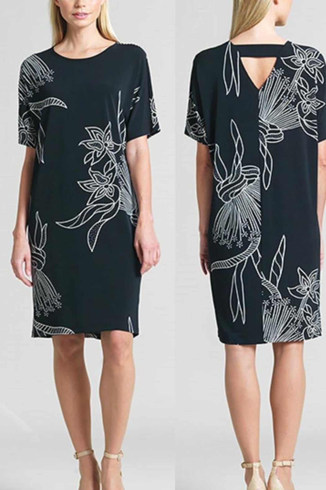 This floral print dress features a v cut out on the back, in colors of black and white. The short sleeve hits above the elbow and length is just above the knee. A modern silhouette is great for a summer evening outing with friends. Travels great as the fabric is wrinkle free and may be hand washed. Hang to dry. 70%Polyester, 20%Rayon and 10% spandex.