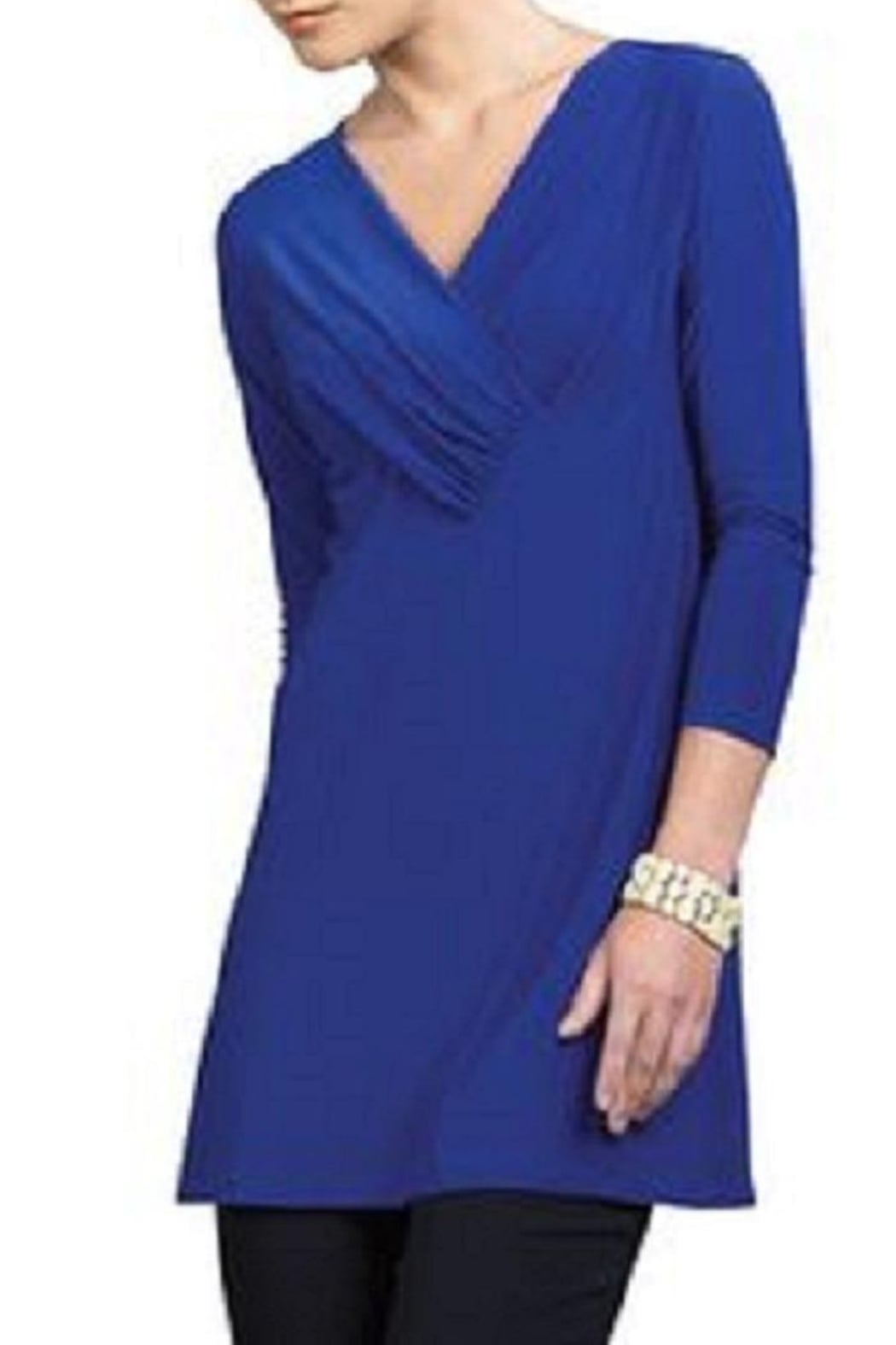 This beautiful royal blue tunic top by Clara Sunwoo features an envelope, pleated, v neck that begins at the shoulder line and drapes down into the v leaving a pleated formation. The top is long flowing past the hips. 3/4 length sleeves.