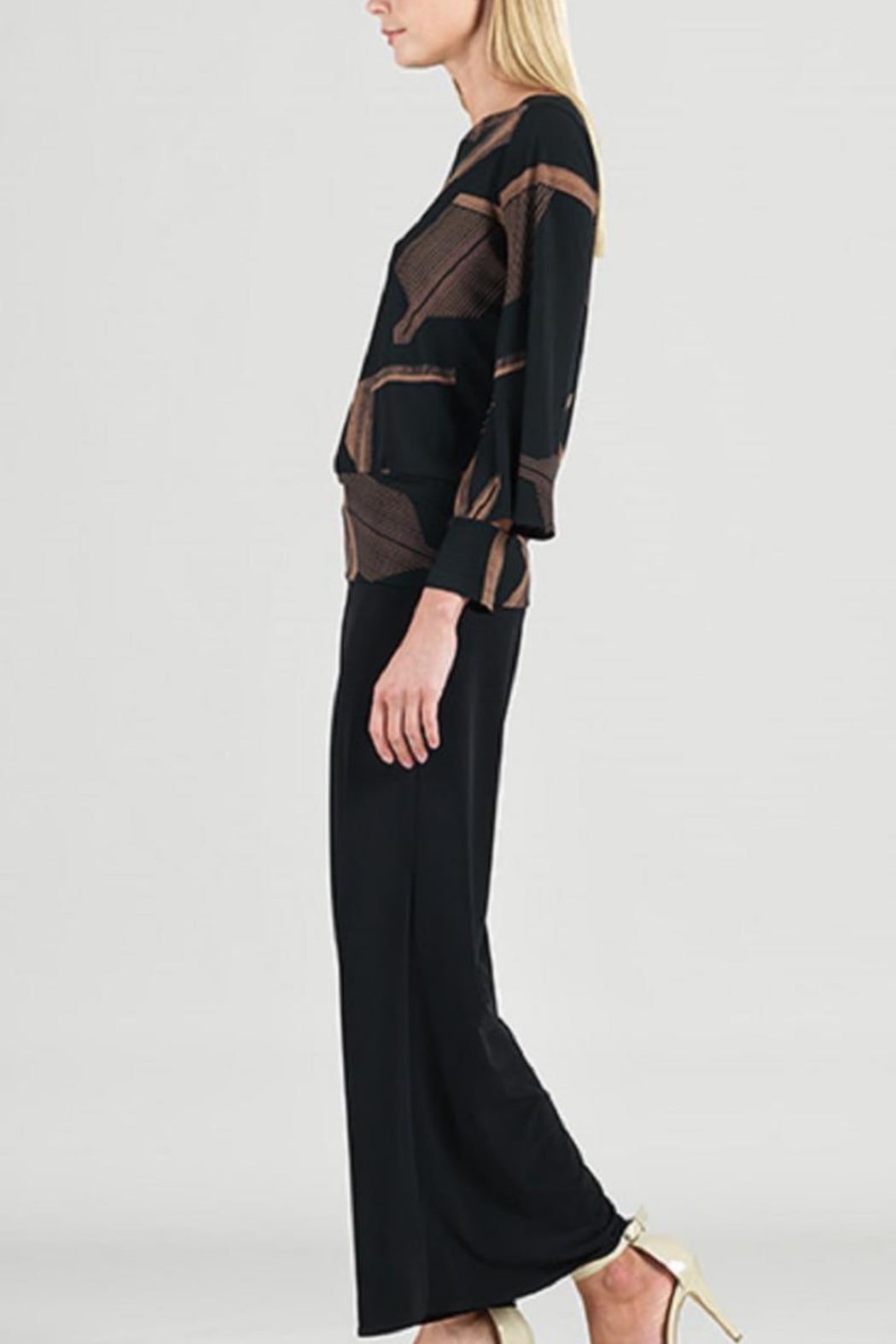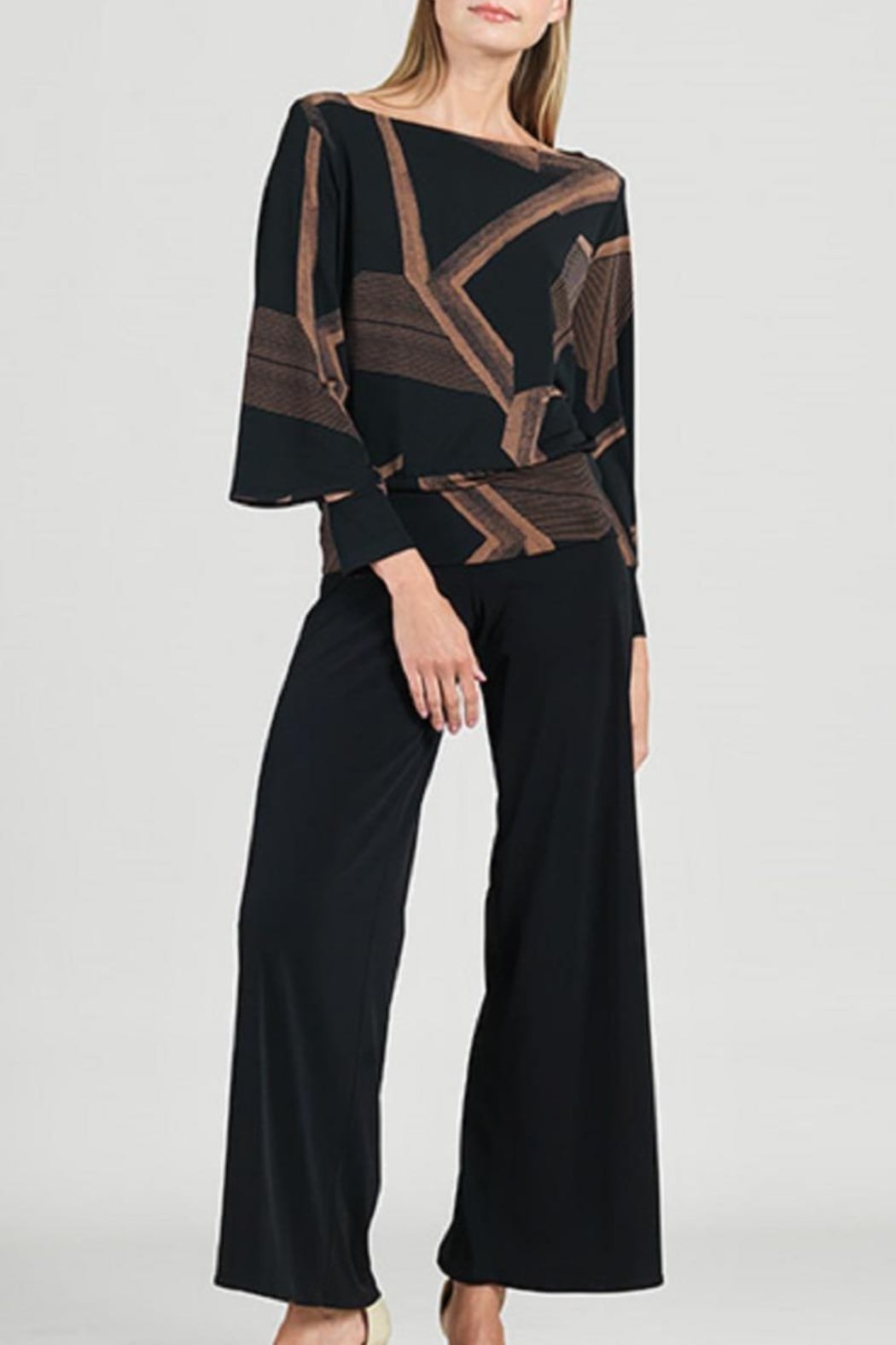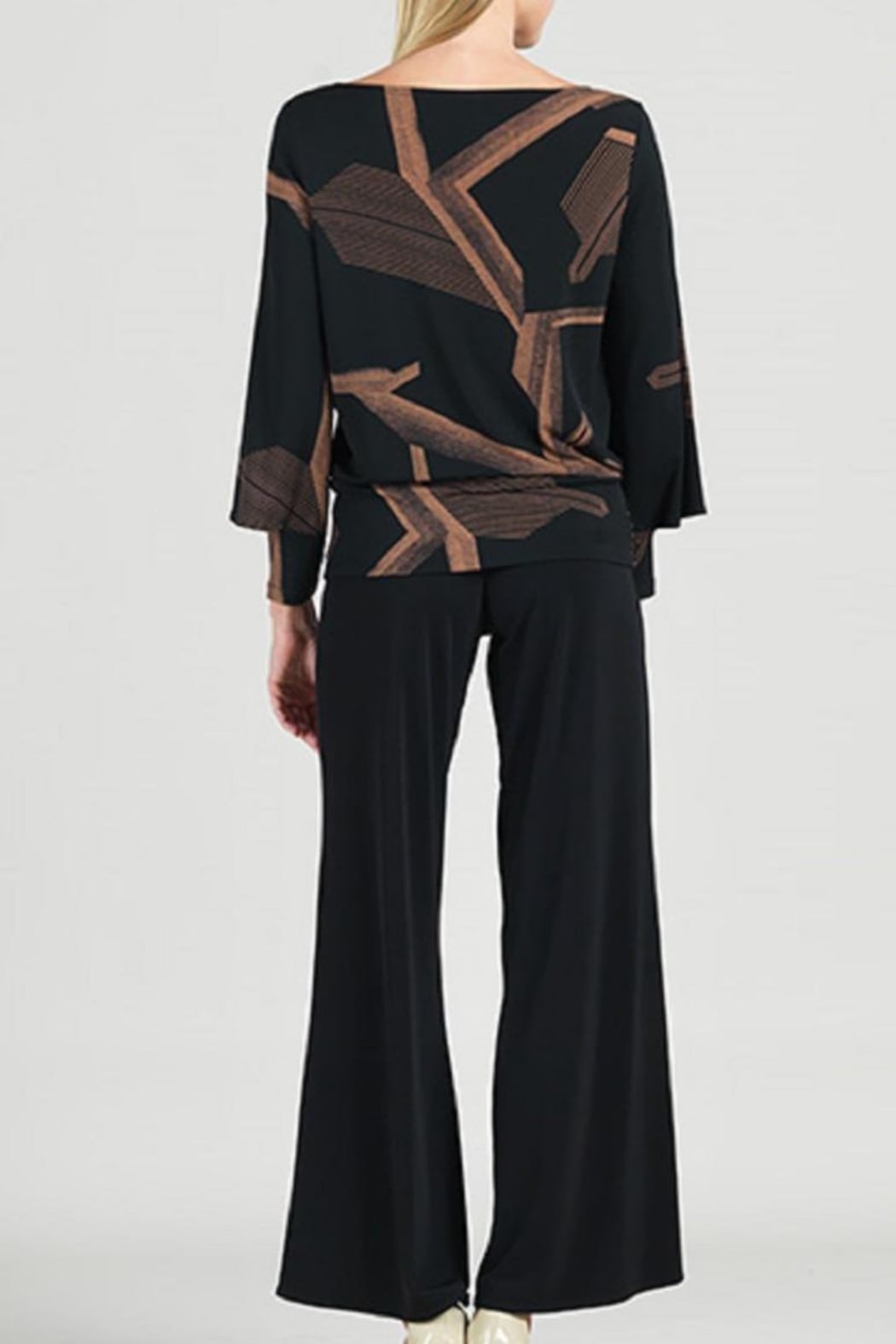 This Geometric Print of Black and Tan/Coffee colors, portrays a wide square bateau neckline. The sleeves have a cuff design and bell overlay at the 3/4 mark. Very dramatic styling. So it is long sleeve and 3/4 sleeved belled combination. Loose to the waist and then a hipster band, but not too tight. Cute styling will look great on your next night out. Wear with any black pant or skirt. The fabric is soft and silky, wrinkle free and may be washed on delicate cycle or by hand in cool water, and hung to dry.