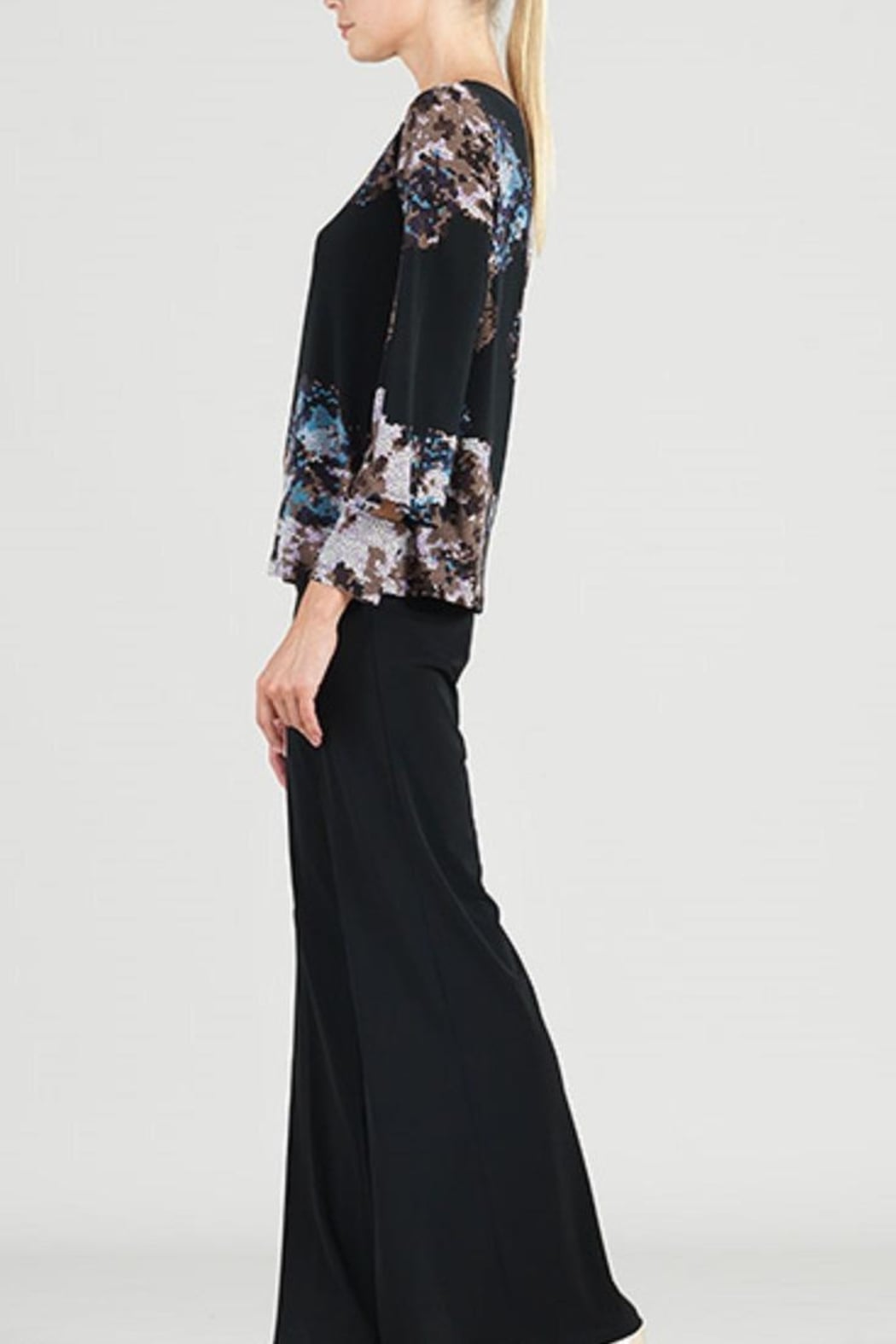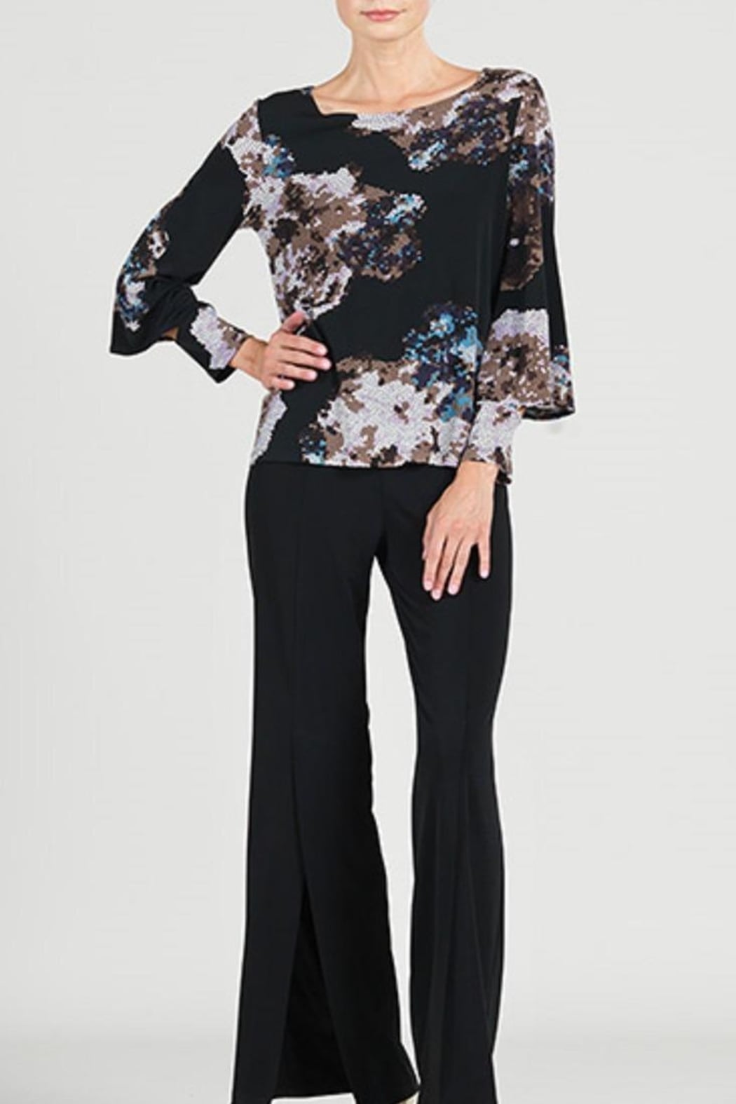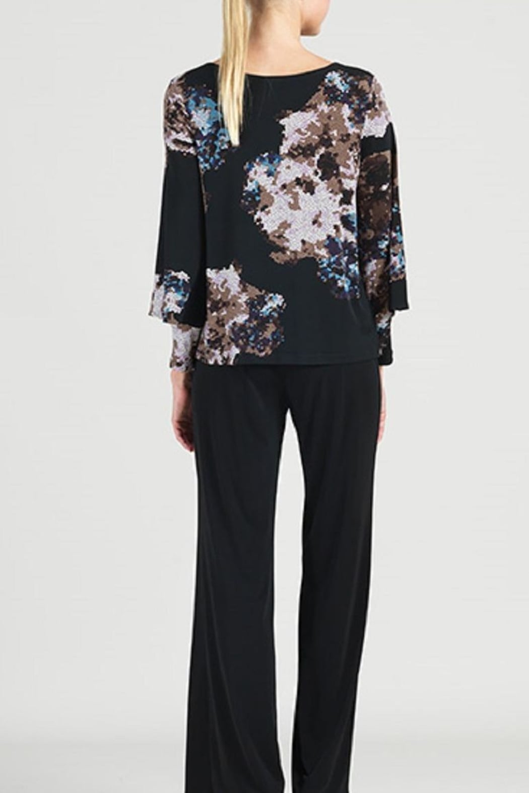 This Clara Sunwoo Mosaic Print Top has a square boat neckline, long sleeves with chic open cuff detail and hip length. Colors include Black, white, brown, blue, and lavender in the mosaic print. Wear with your black pant or skirt and you are good to go. Fabric is soft and silky, and may be washed in cool water on gentle and hung to dry. Wrinkle free.