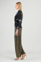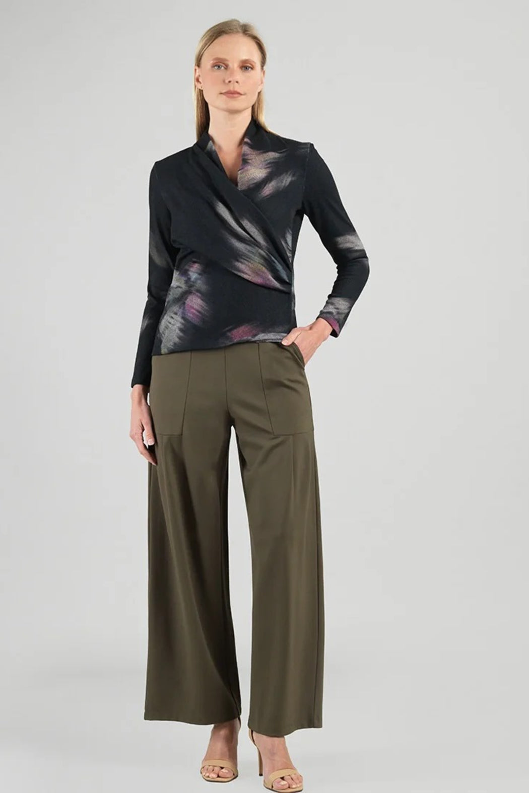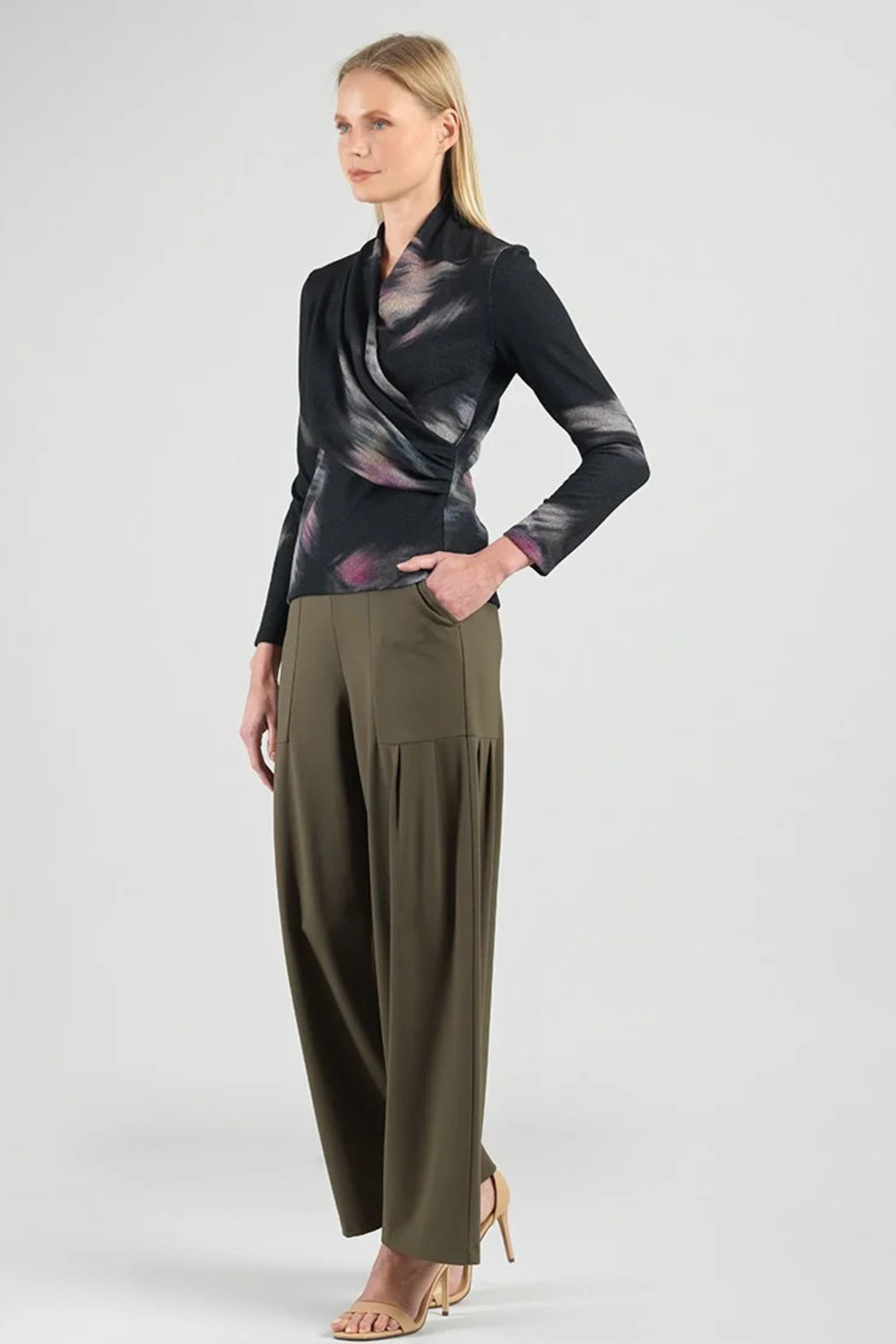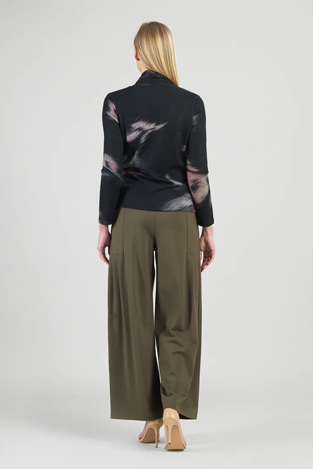 The artistic print showcases sweeping brush strokes in muted plum, forest green, soft ivory, and slate blue, adding depth and dimension against a rich black backdrop. This top is a statement piece that brings elegance and creativity to any outfit.
