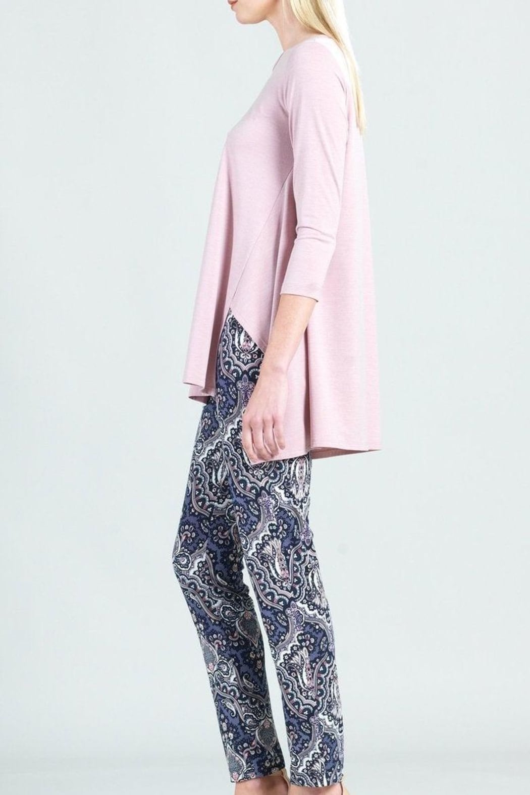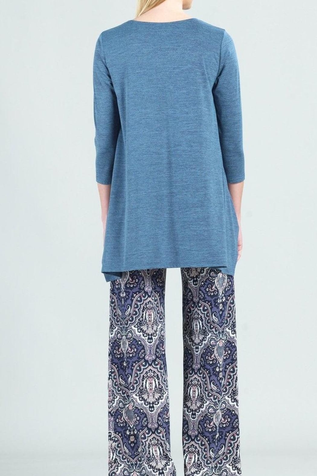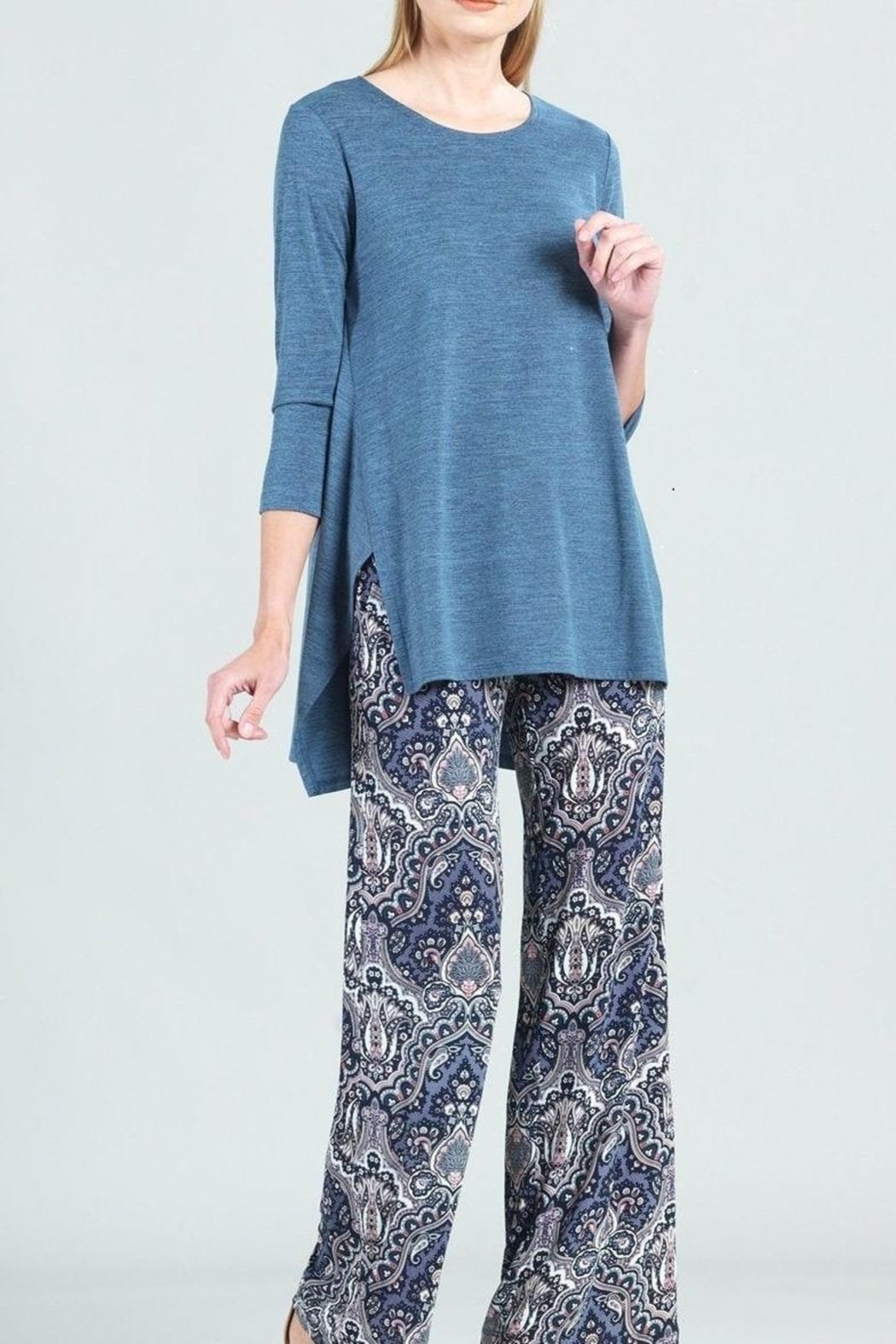 This Soft knit Denim Style Tunic top is a blue/black shaded print tunic top with a scoop neckline, 3/4 sleeves and side openings. The bottom side openings flatter and slim the body as it is loose and flows around the hips. The material is a modal like knit of 70% Polyester/20% Rayon/10% spandex. May be washed on delicate or by hand in cool water and hung to dry. Wrinkle free and matches your black pant or skirt. Model is 5'9" and wears a size xs.
