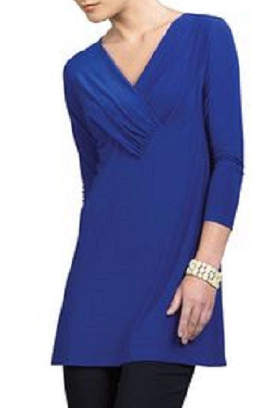 This silky wrinkle free Grey Tunic top has 3/4 sleeves and an envelope pleated style v neck. The neckline drapes in a flattering style, beginning from the shoulder and crosses over, layers into the body of this tunic top. Long length that falls to the thigh on average height. May be washed on delicate in cool water or by hand and hung to dry. Also available in royal blue in some sizes.