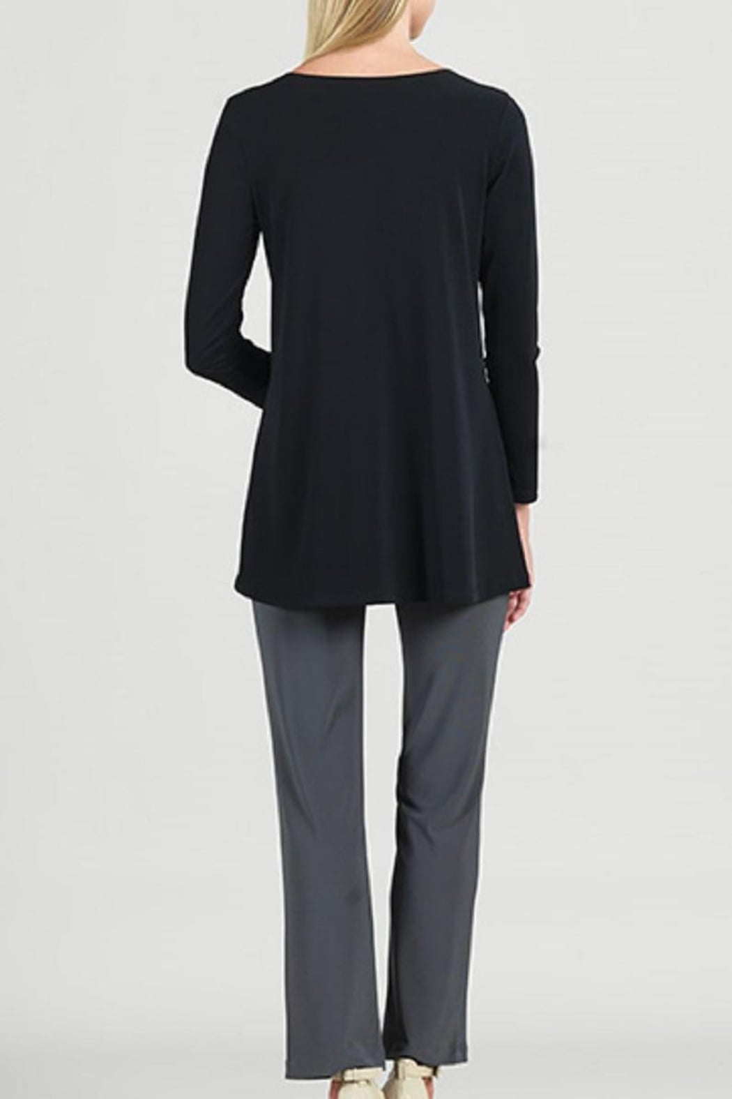 NWT This Black and Grey color blocked tunic top has a vneck and long sleeves. Falls below the hips with a soft flowy hem. The body is a grey and black abstract pattern. Wrinkle free material to be worn with your grey or black pant or skirt. Wash gently in cool water and hang to dry.
