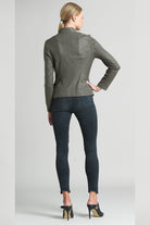 When innovation is combined with edge you'll be sure to see our Liquid Leather Biker Jacket! A unique design which is made from our beautiful signature stretch knit, extremely lightweight soft "lambskin feel" fabric with a soft matte finish. This jacket features a notched lapel with upright collar, long sleeves with upper arm stitching, a rustic gold asymmetrical waist zip-up closure, faux pocket zipper slits and peplum waist seam with structured double tiered flaps, as well as curved and vertical back seams that provide a more shaped and slender silhouette. Our Olive is a darker neutral shade with sage undertones. Inspired by luxury motorcycle jackets, the interior is made from soft knit giving it the right amount of stretch with breathable superb wear that conforms to your body and provides you with the utmost comfort. Liquid Leather Knit Made from our signature soft stretch poly blend fibers with a coating of faux liquid leather matte finish. Easy care, quick drying and cooler than linen or cotton. Travel Friendly Ultra Lightweight Soft Knit Fabric - Faux Leather Matte Finish