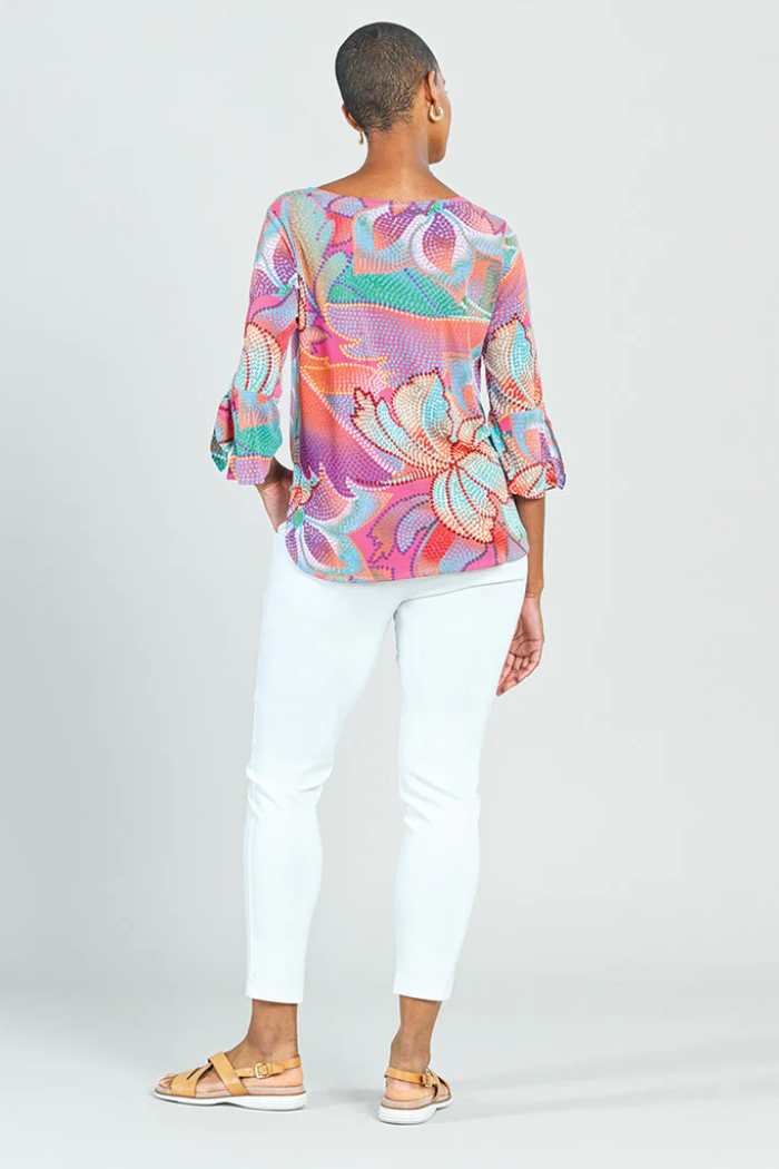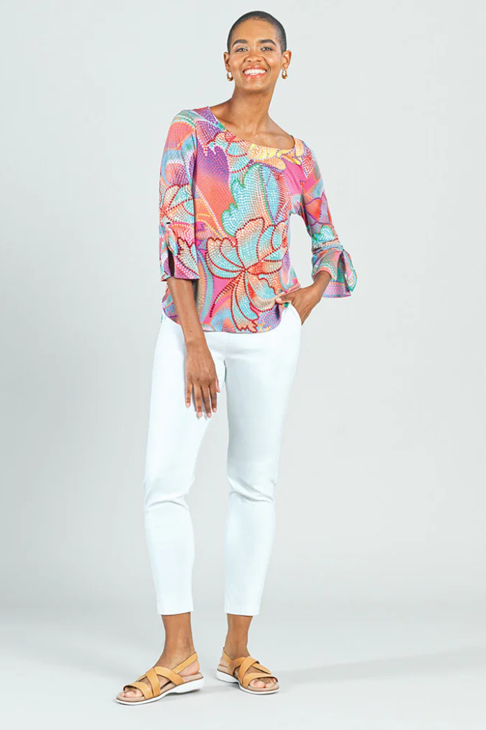 Strut your stuff in this stunning mosaic print top! The vibrant colors and tie-able cuffs make this a perfect conversation piece to add to your wardrobe! Round neckline, 3/4 length sleeves