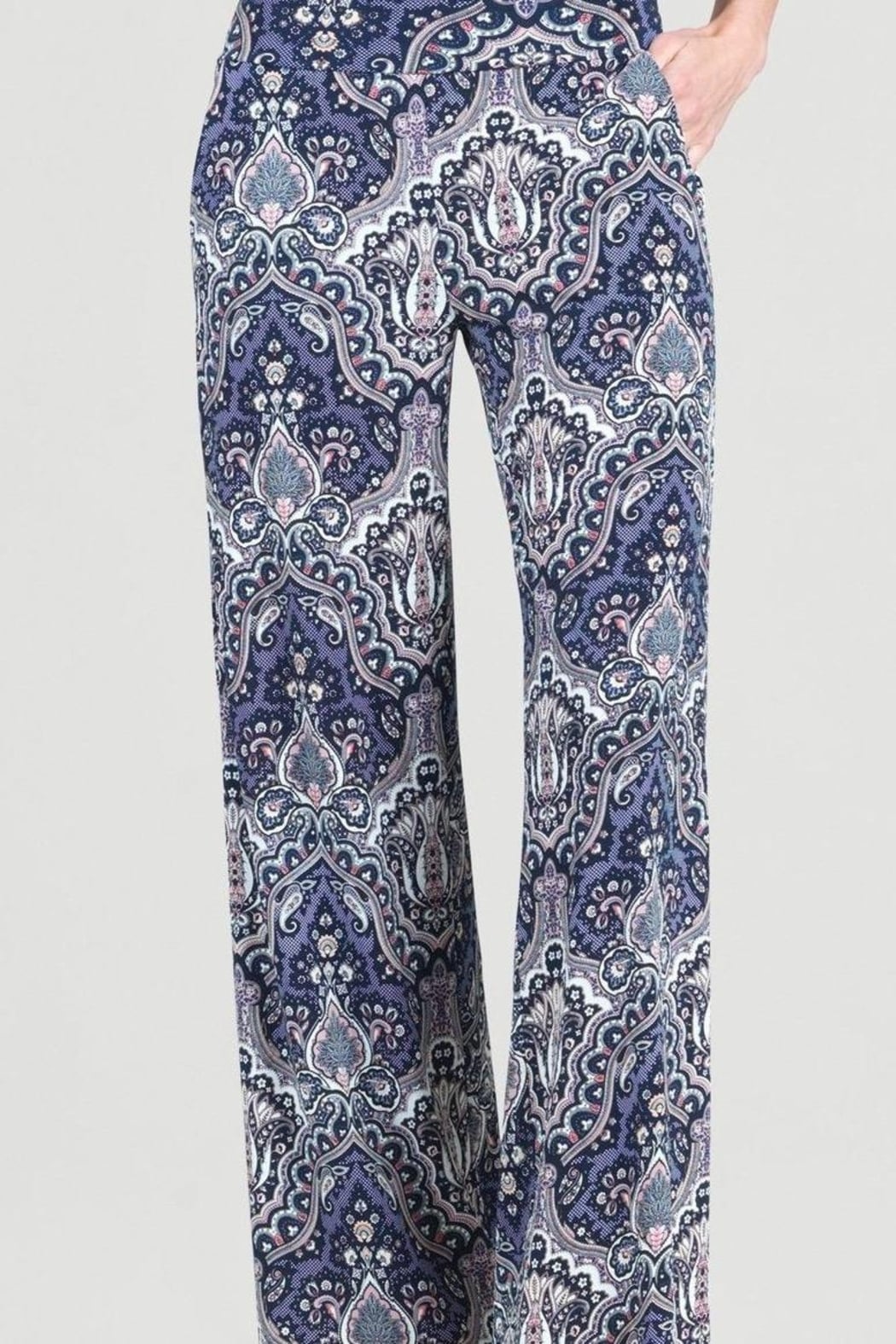 NWT pull on paisley print pant of silky soft Poly/Rayon/Spandex blend. Colors of soft blush pink, Navy, light grey, white, ivory and black. Comfort waistband and belled ankle with two side pockets make up this interesting pant. May be washed on delicate or by hand and hung to dry.