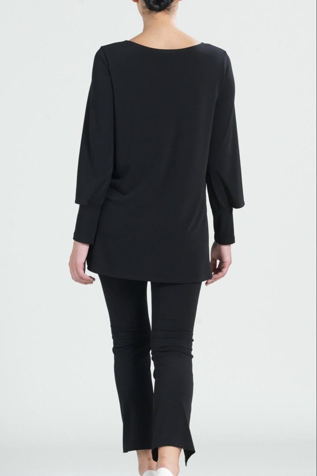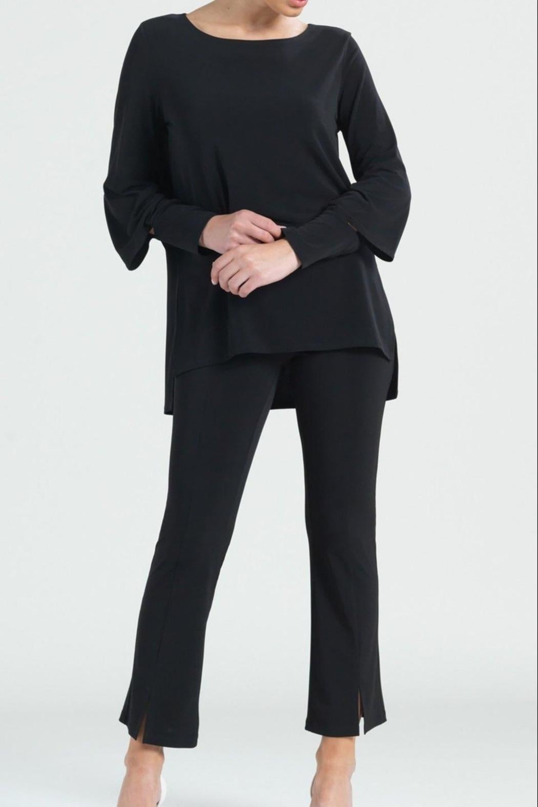 This soft knit black tunic top has a round scoop neckline and long sleeves with an open slit cuff. The body is a high low style, longer in the back by 2 inches. The sleeve is loose and flowing with an open style cuff. Loose fitting. Wash on delicate or by hand in cool water. Hang to dry.