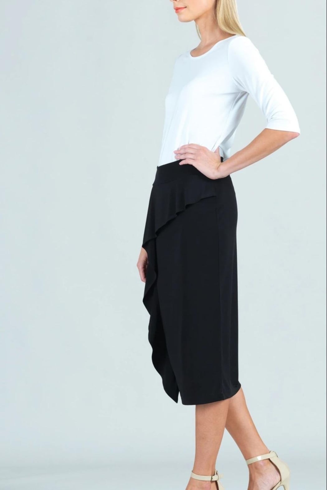 This classic midi skirt is good for any occasion. The ruffle in the front adds a little touch of fun. We do recommend sizing up for the perfect fit. This is made of the companies perfect blend of fabric so it should not wrinkle so it's perfect for traveling.