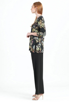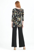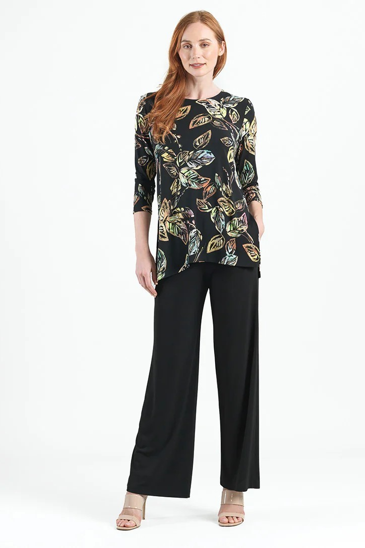 This tunic features a round neckline with 3/4 length sleeves, an angled hemline with 2 side vents that create a very flattering silhouette. The colors in this top are absolutely gorgeous and the dark background makes them so vibrant. Each piece is unique and one of a kind as print placement will vary. The fabric is wrinkle free and travel friendly!