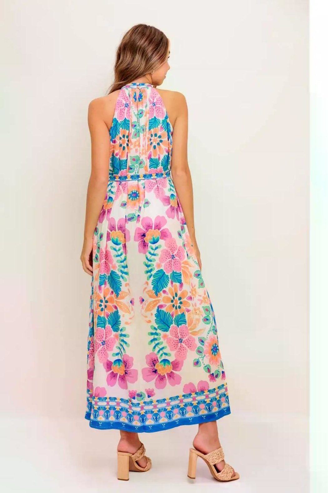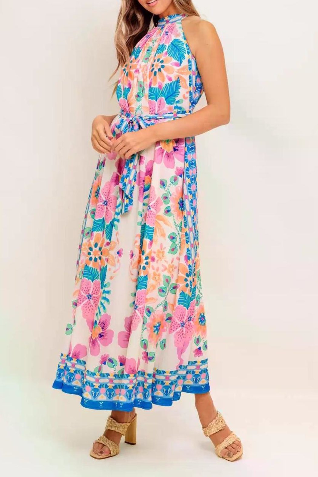 A printed woven maxi dress featuring halter neckline, self sash tie and back button closure