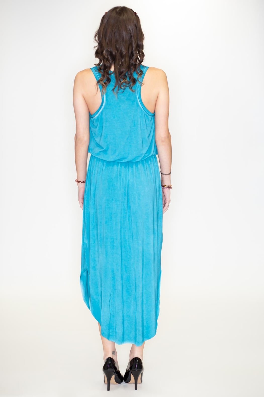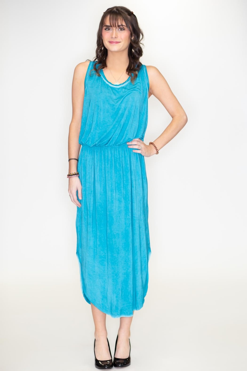 Turquoise lightweight stretchy dress with side slit detail with elastic band on the waist with raw hem for every hem. High and low with round raw hemline.