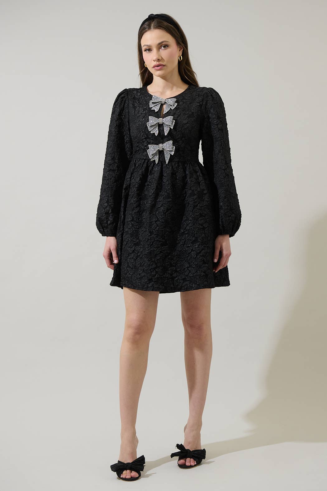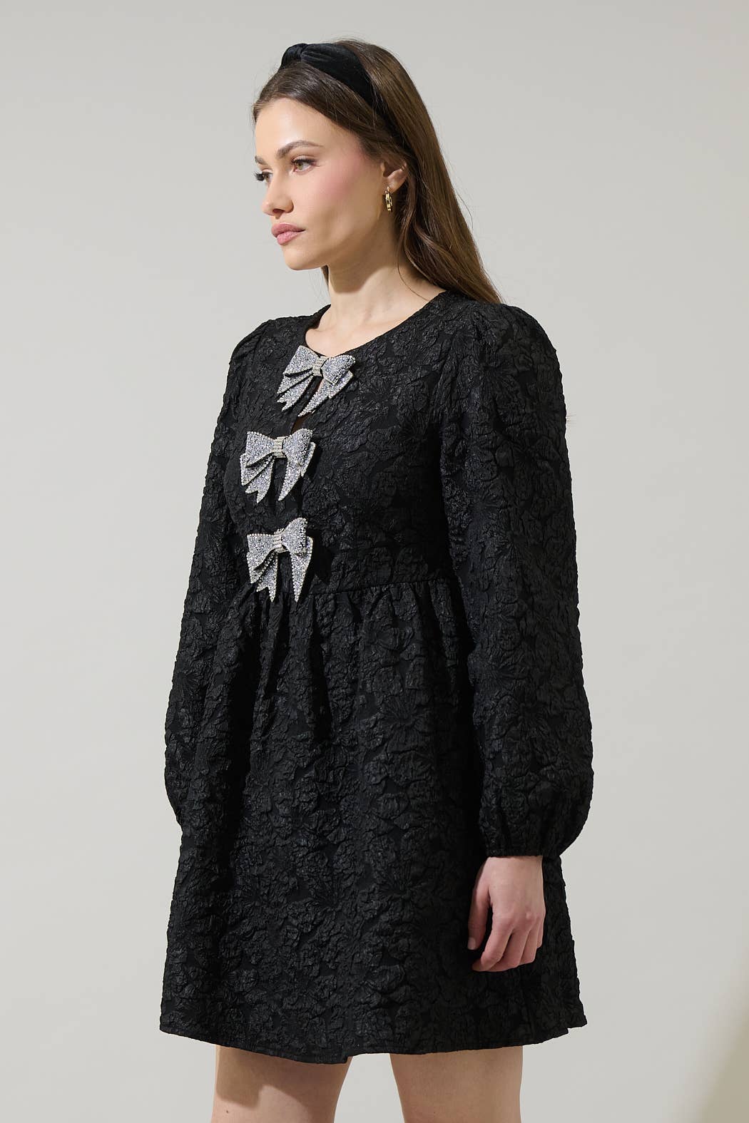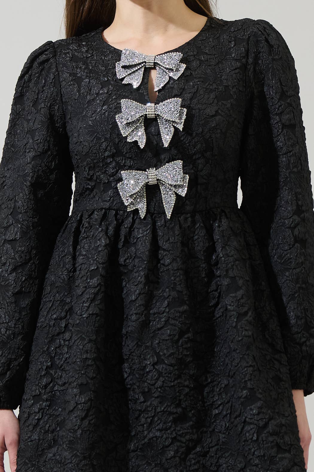 Turn heads at any celebration in the stunning Arielle Jacquard Glow Bow Dress! This party-ready dress is composed of stretchy velvet fabric that shapes long sleeves, a round neckline, and a princess-seamed bodice adorned with cute bow-inspired details and flirty keyhole cutouts at the center. Itβs so cute to wear with some heels and long earrings to enjoy the day or night!