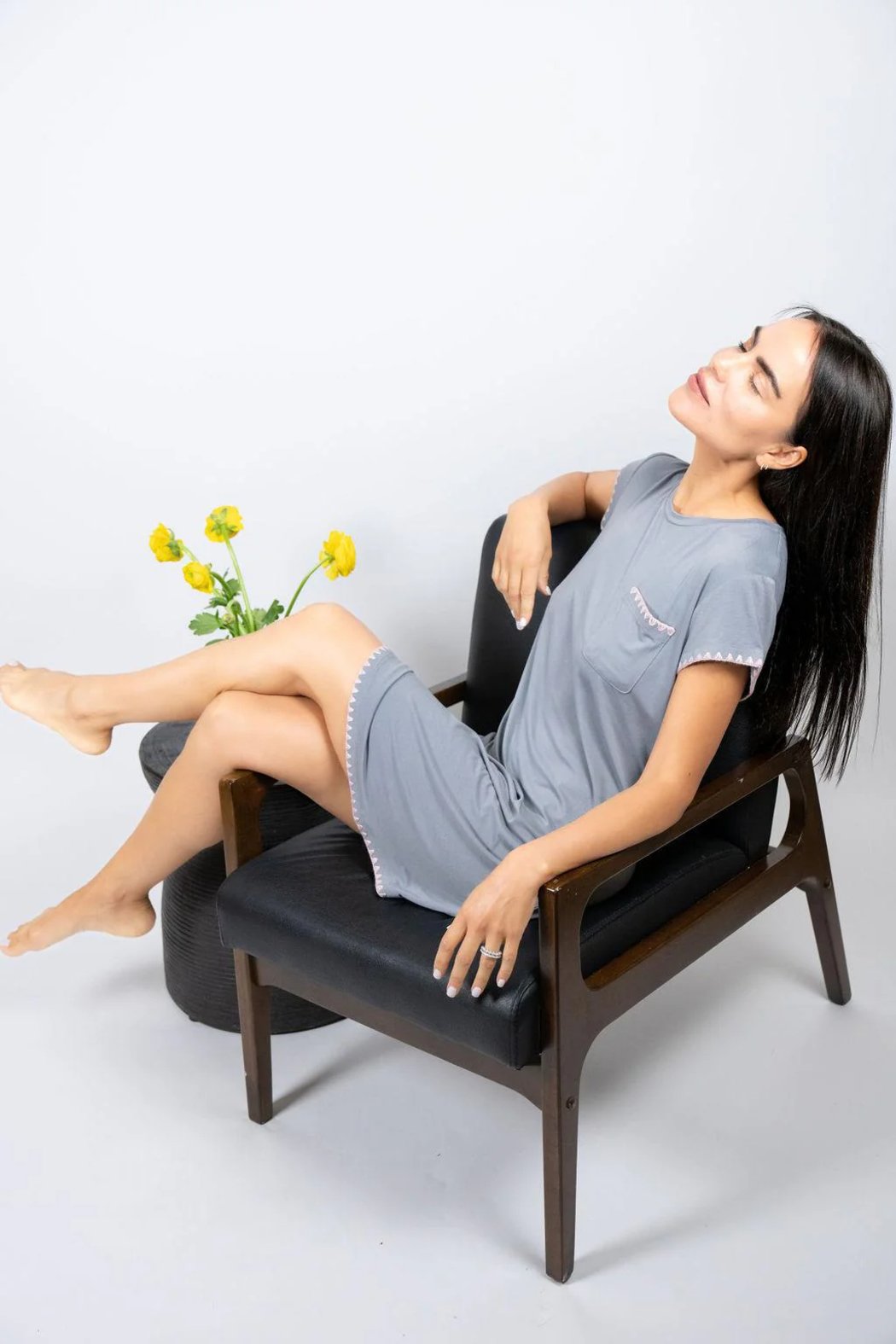 Cute Stitching Dress in Night Owl color features soft Rose Powder stitching details and a chest pocket for added convenience. With a comfortable knee-length fit, it's perfect for lounging or sleeping. Made from light, breathable bamboo fabric, it offers a soft and pleasant feel against the skin, ensuring ultimate comfort for your relaxation time.