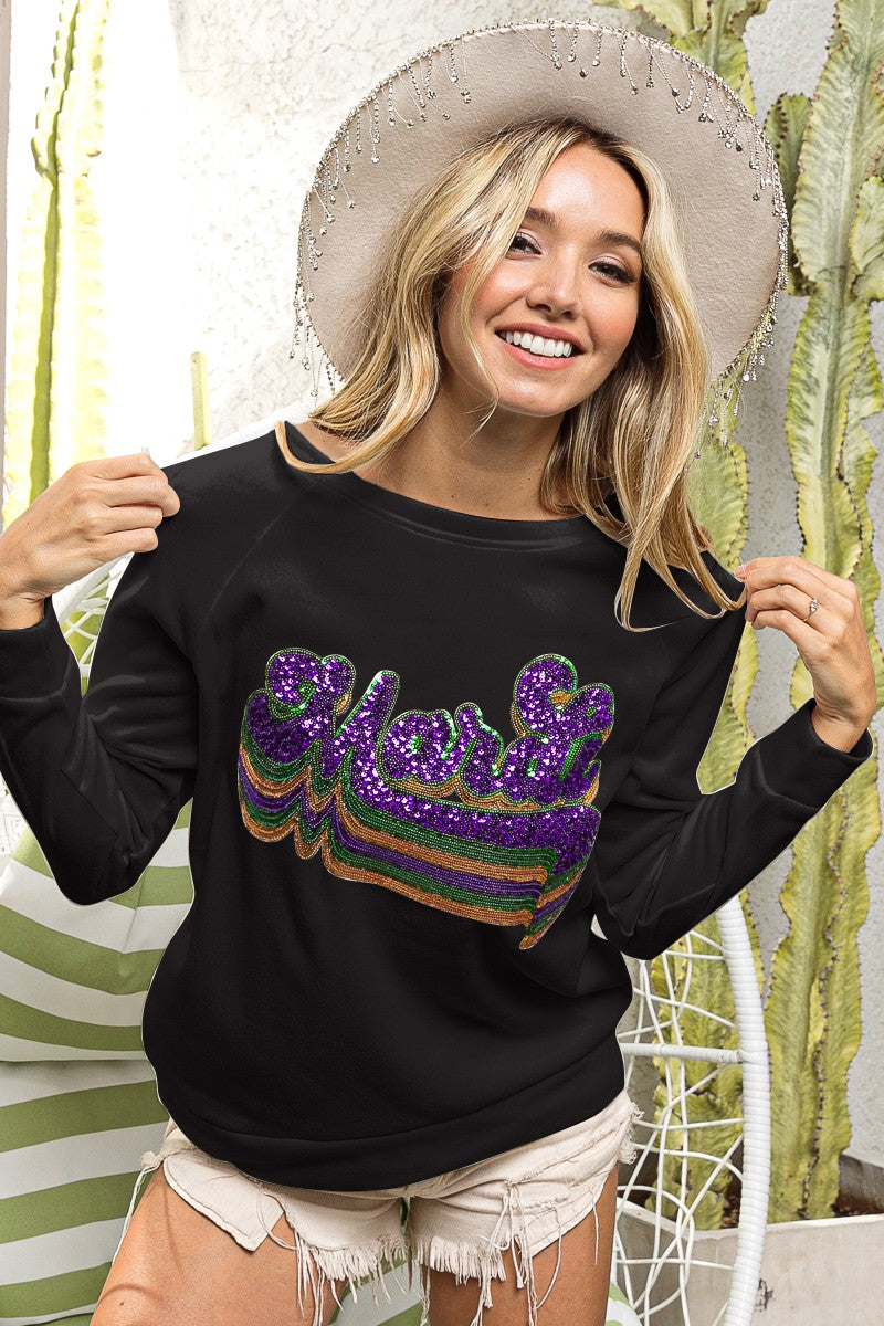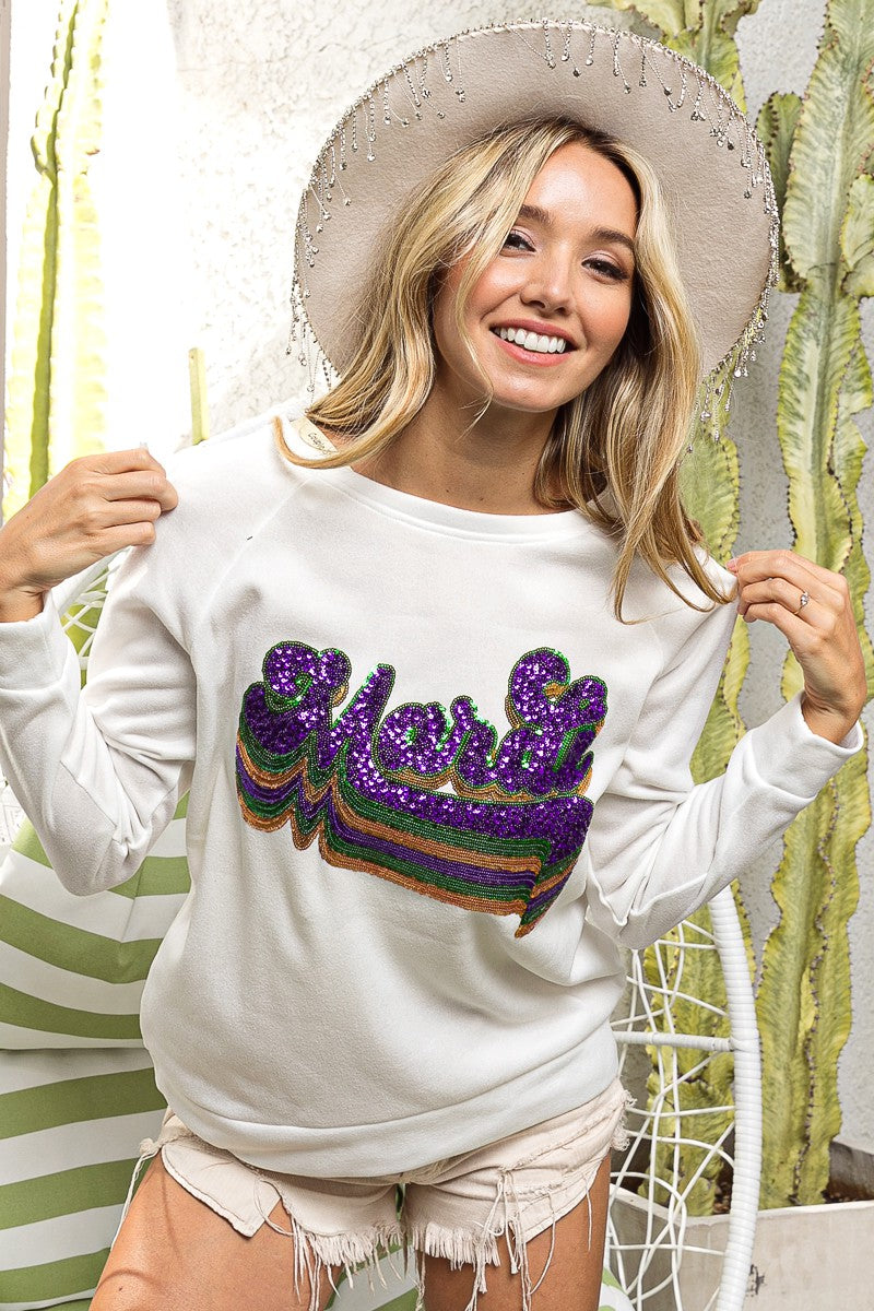 LAYERED MARDI SEQUIN LETTERING PULLOVER