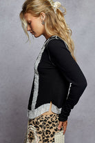 A ribbed long-sleeve top with raw-edge lace trim for a lived-in, feminine look. The Black Rib & Raw Edge Long Sleeve Top pairs fitted rib knit with vertical and collar lace accents for subtle texture. POL infuses bohemian detailing into an everyday crew-neck silhouette that layers easily from day to night.