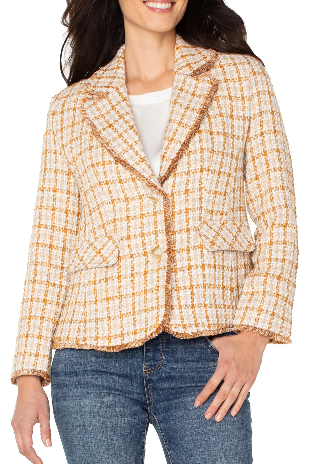 Rendered in a rich gold khaki plaid, this blazer blends timeless structure with unexpected edge. Frayed detailing softens the silhouette, offering a modern contrast to its tailored lines and heritage feel. Whether layered over a sleek knit or worn with relaxed denim, it brings effortless polish to every look.