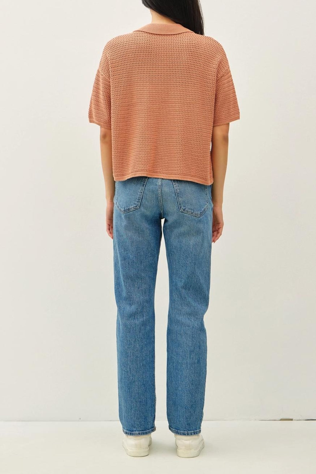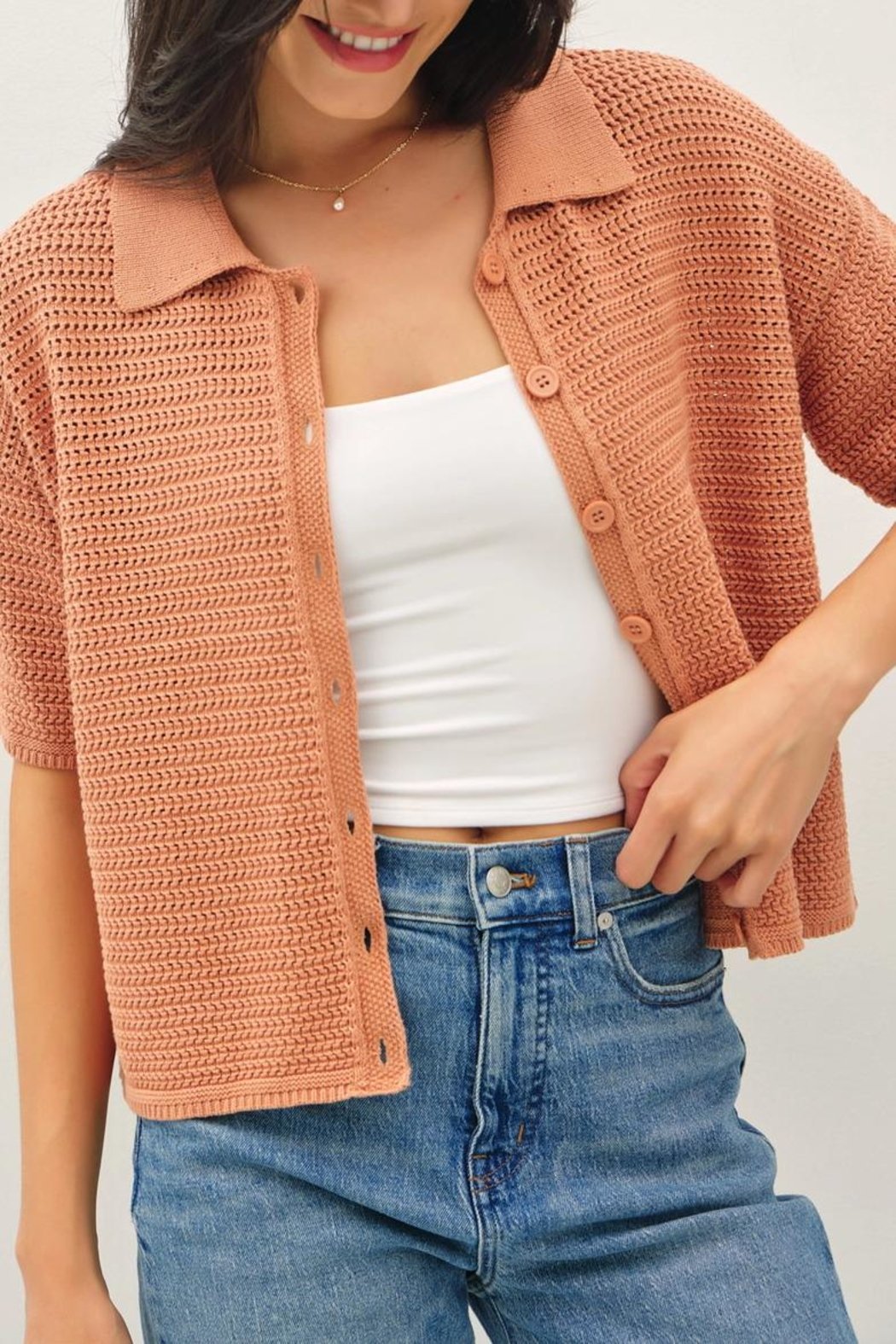 * sweater * button up * shirt style * short sleeve * drop shoulder * collared * crochet * cotton * boxy, relaxed fit