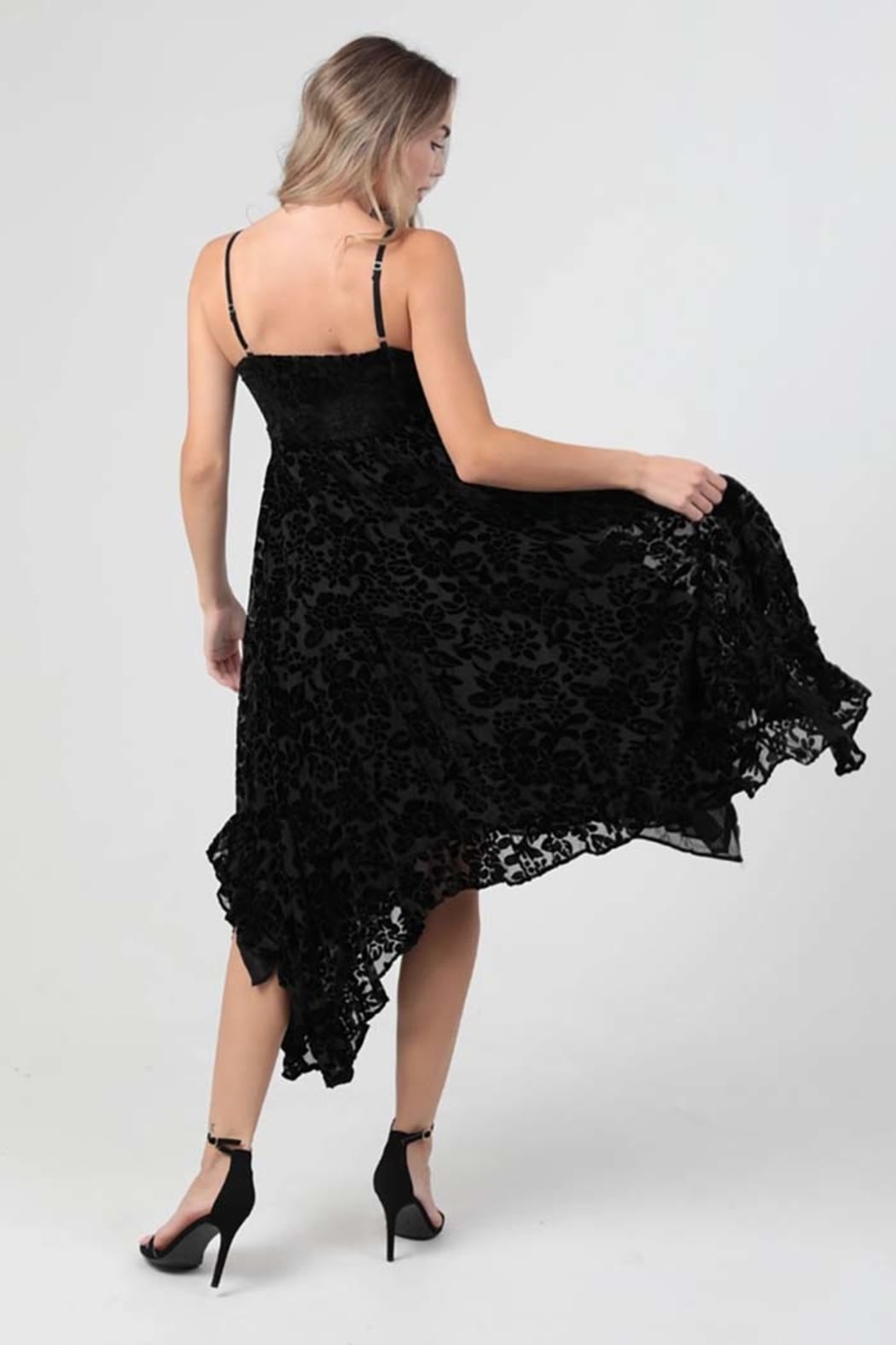 velvet burnout dress, boho black dress, twist front dress, hanky hem midi, velvet evening dress, floral textured dress, boutique special occasion dress