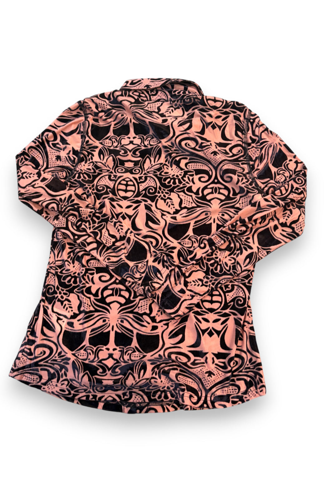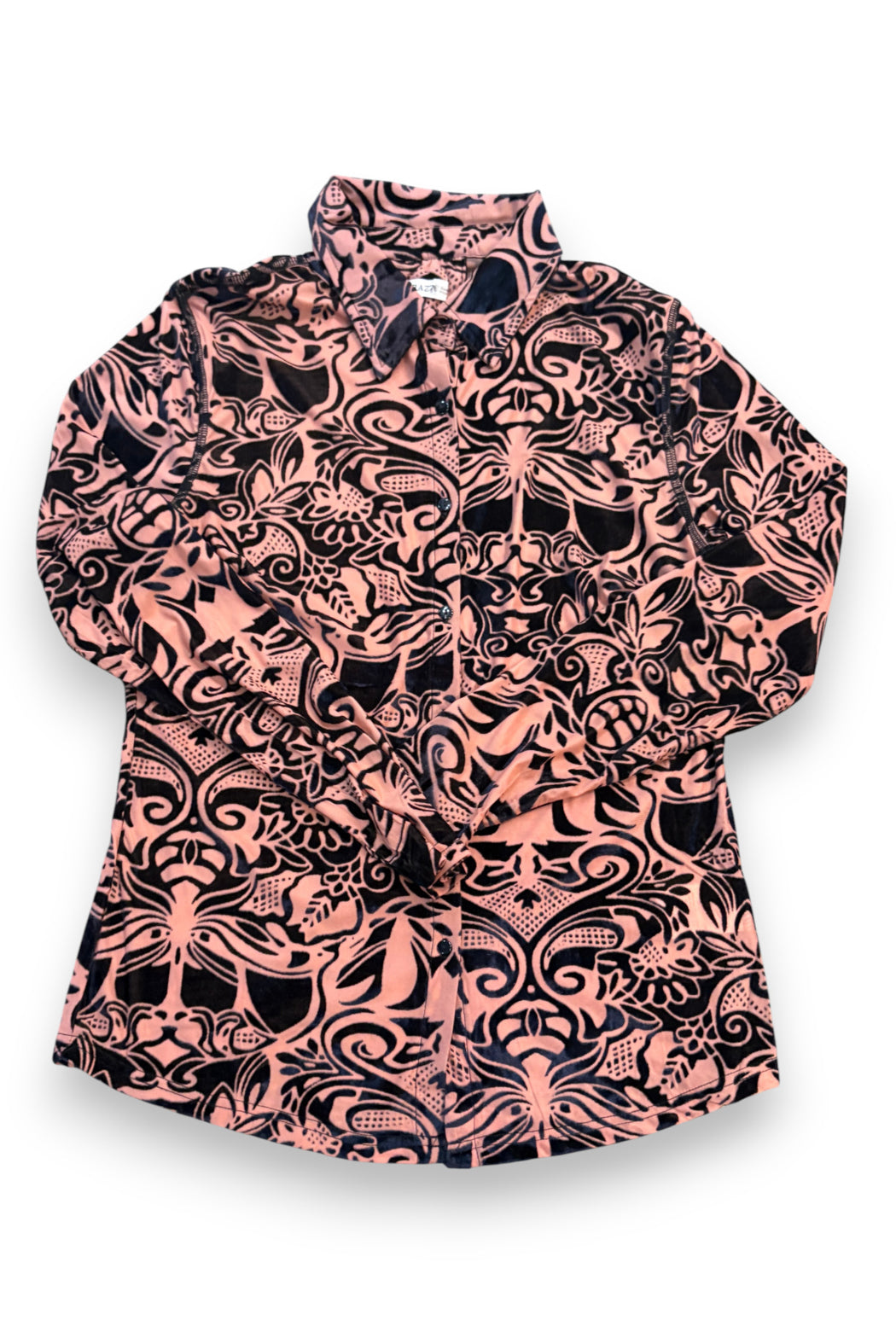 This Burnout Velvet Knit Button Up Blouse is a vintage-inspired button-up in a soft burnout velvet knit with an allover abstract motif. The collared silhouette and long sleeves give it a polished feel while the plush texture adds luxe interest. Paparazzi by Biz designed this piece for layering over tees or tucked into high-waist trousers for evening or weekend looks. It reads both casual and dressy depending on how you style it.