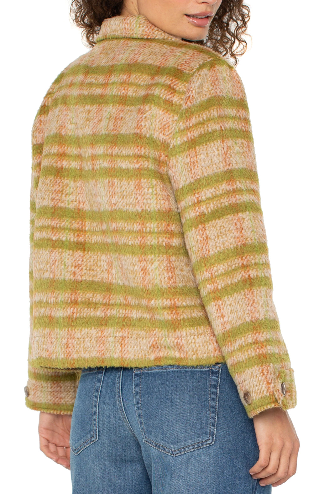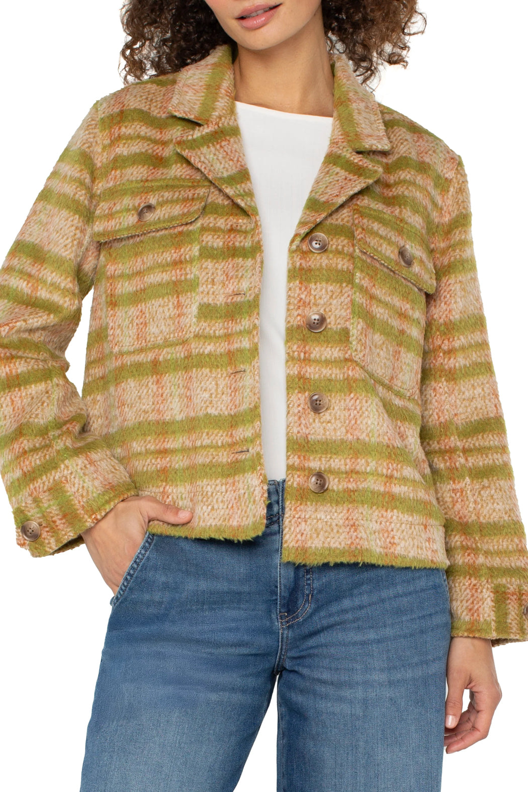 Our boxy jacket is relaxed and easy to wear. Keep it chic with skinny jeans and a fitted knit top for a dressed-up casual look. DETAILS: 23-1/2” High Shoulder Point Lined Button front closer Extended tab closure at cuffs 2 front flap pockets with button closure Slant side pockets Wash inside out, Wash Separately, Machine wash cold Gentle cycle, Do not bleach, Dry flat Cool iron if Needed ,Or dry clean