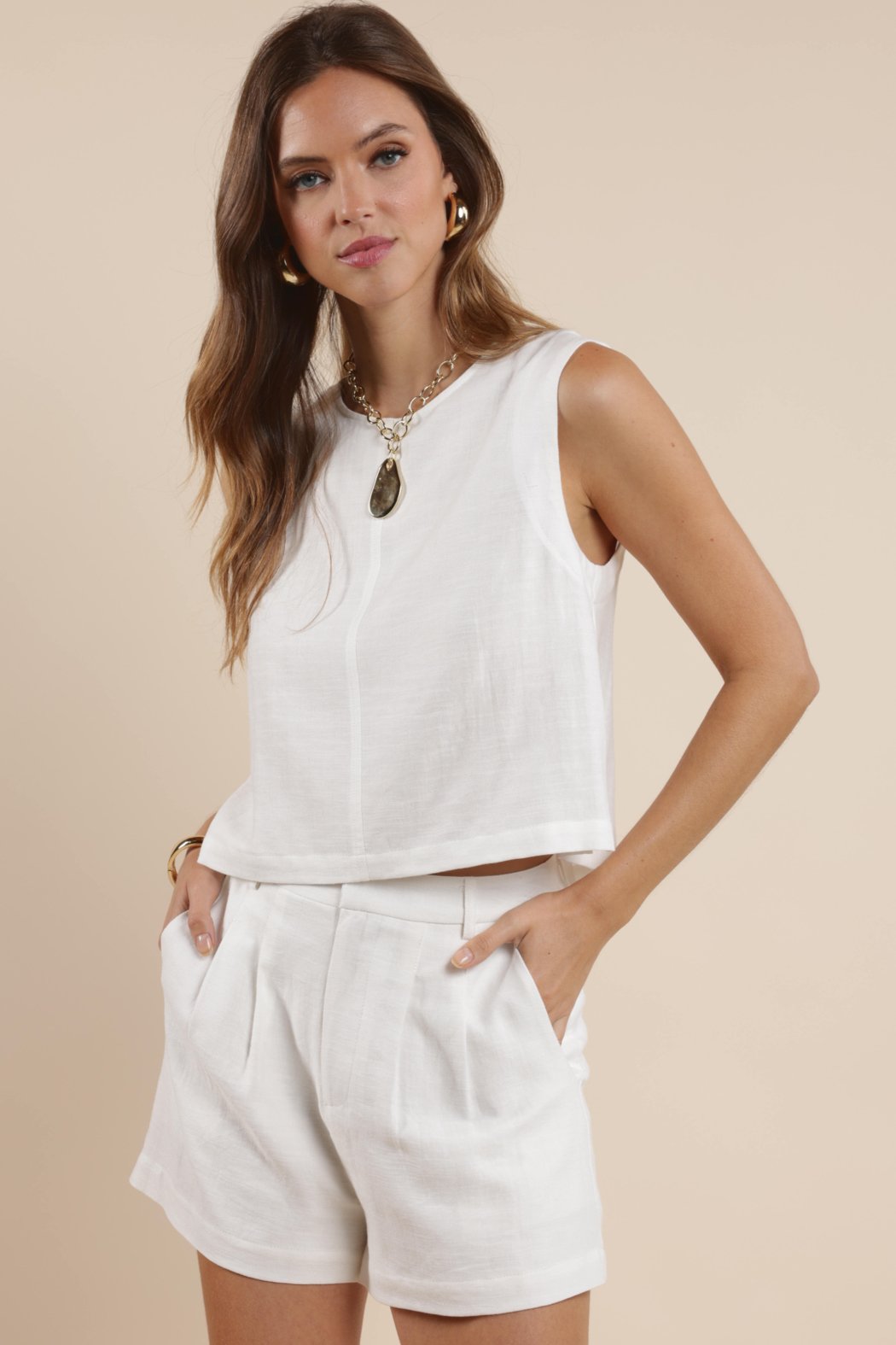 Breeze through warm days with effortless style in the Coastal Calm Linen Short. Crafted from lightweight linen, these high-rise shorts feature soft pleats at the front for a tailored touch, while side pockets add functionality. The relaxed silhouette and breathable fabric make them perfect for seaside strolls, weekend getaways, or simply lounging in style. Pair with the matching linen top for a chic, coordinated look that embodies coastal ease.