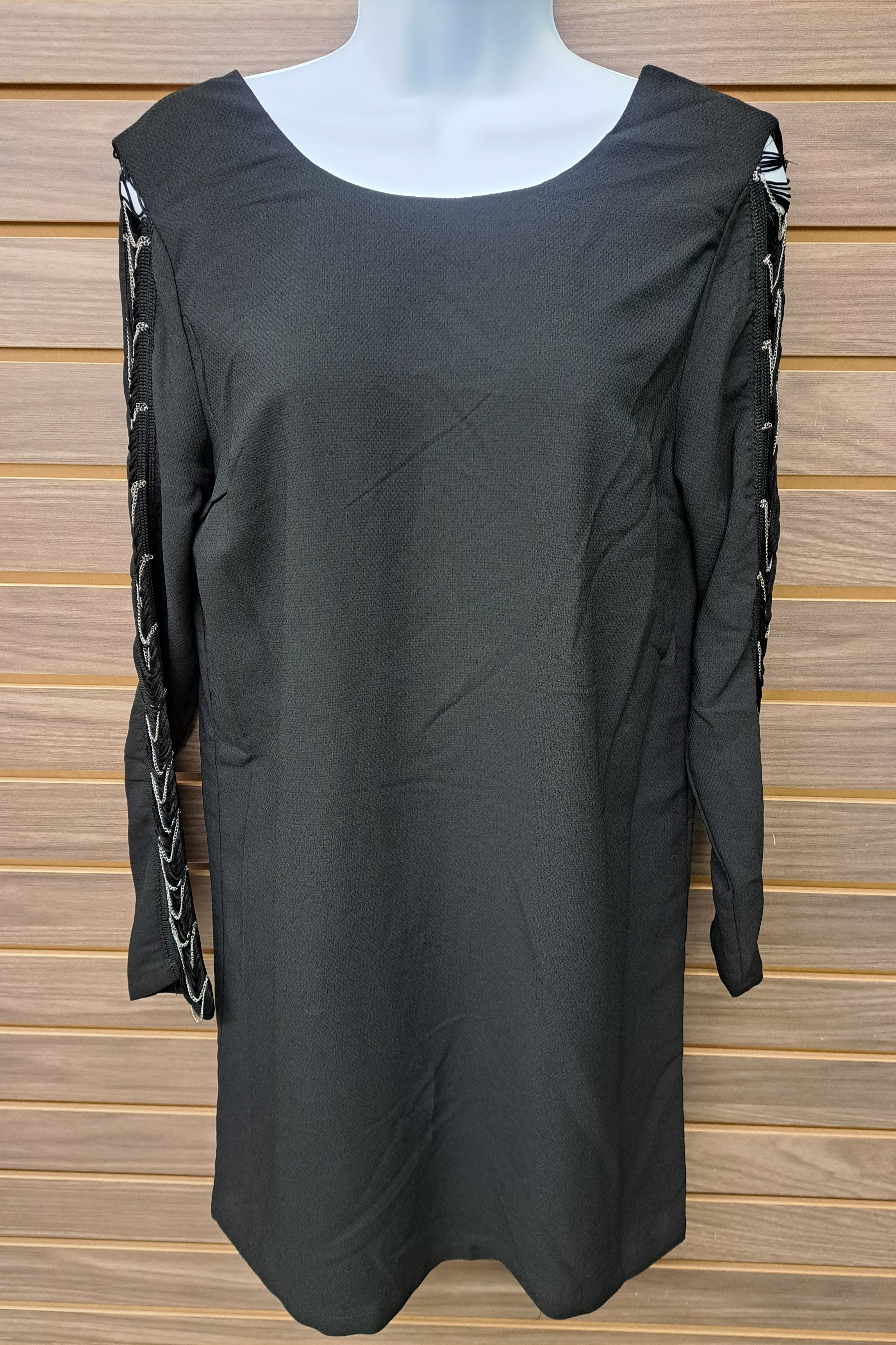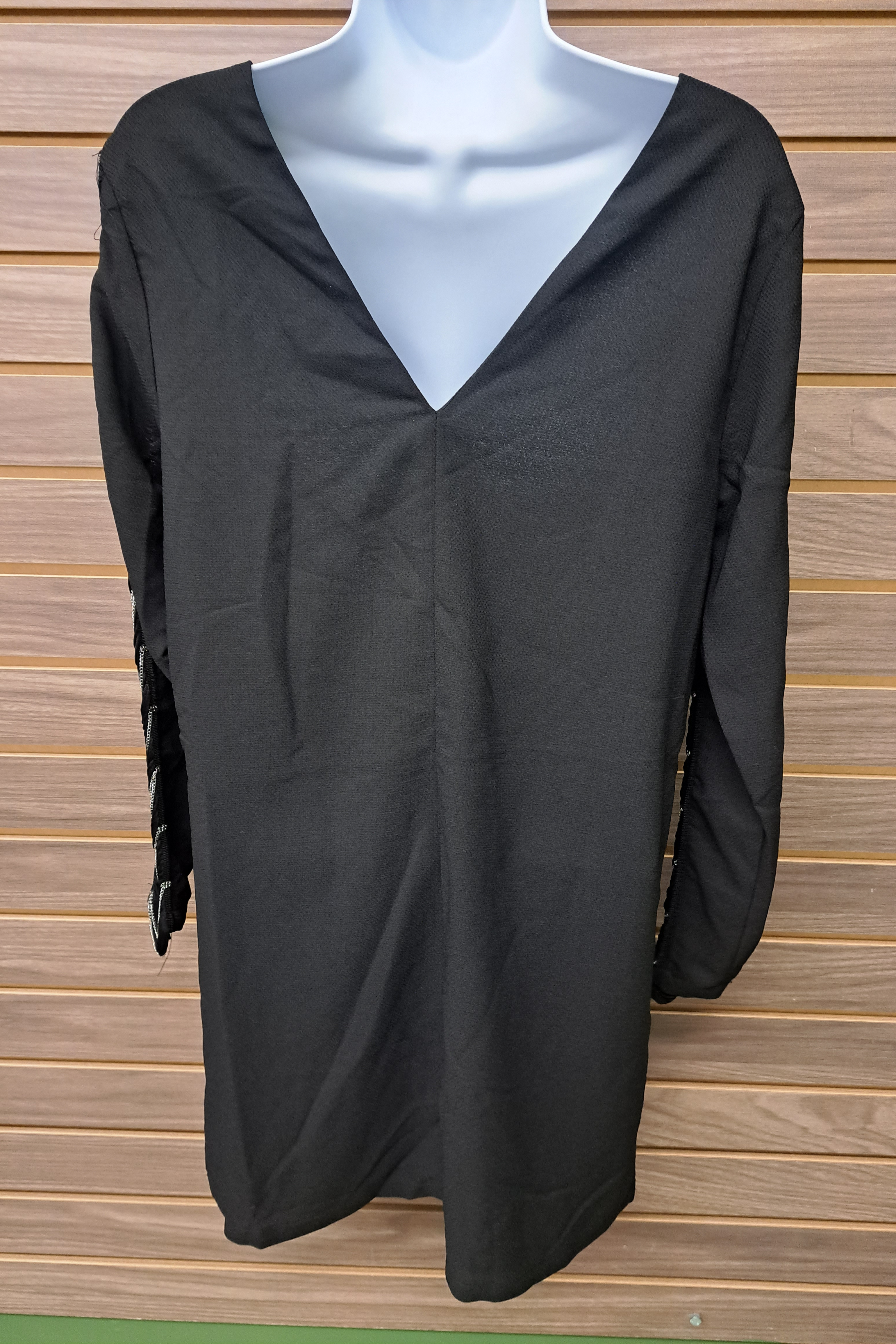 This stylish Decorative Chain 3/4 Sleeve Black Dress is perfect for your next night out. Featuring a V-back and subtle chain detailing on the sleeves, this dress is sure to turn heads with its sleek design and flattering fit.