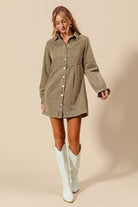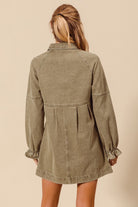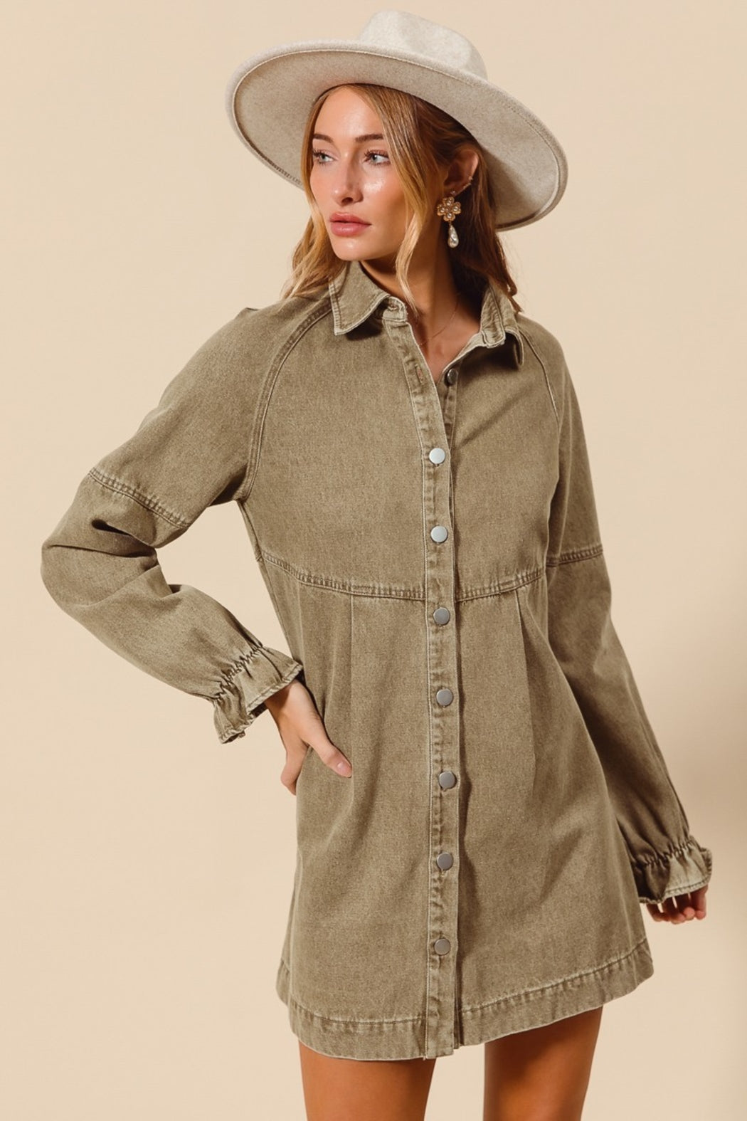 The Denim Shirt Dress is a washed color denim button down mini featuring a collar neckline with long blouson sleeves, and side pockets. Pair with boots, flats, or heels for a fun flirty look!