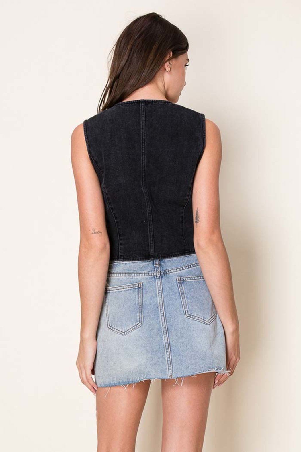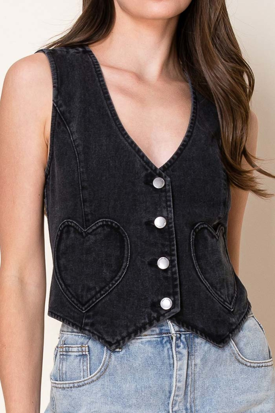 Turn up the charm with this black washed denim vest featuring adorable heart-shaped front pockets and sleek silver-tone buttons. Designed with a flattering v-neckline and pointed hem, this cropped silhouette adds a playful twist to edgy streetwear. Crafted in soft cotton-blend denim for comfort and structure, it's perfect for layering over graphic tees or pairing with skirts for a downtown-cool look.