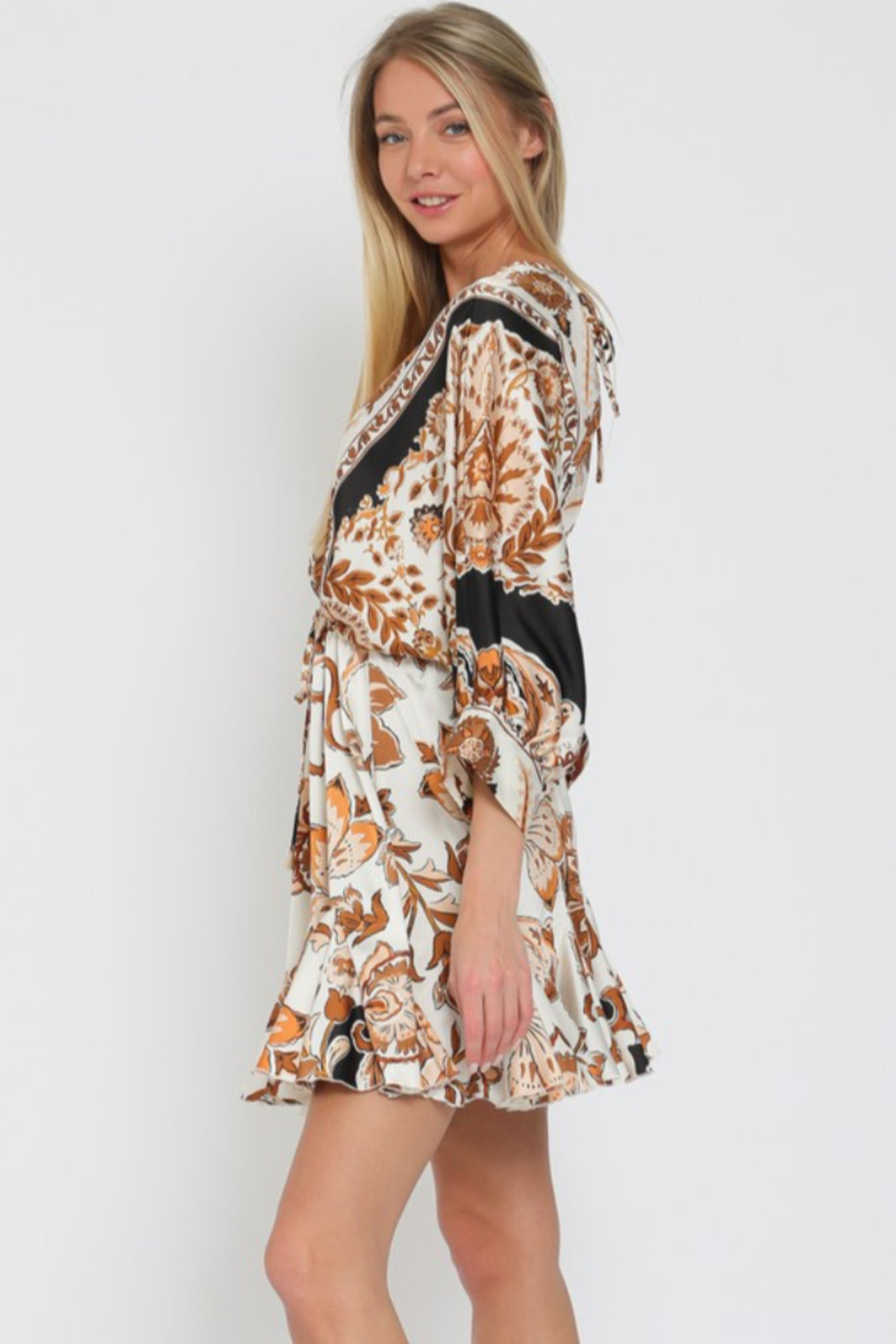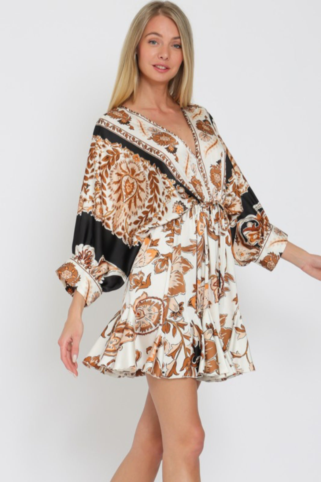 The Dolman Sleeve Boarder Print dress features a v-neckline, 3/4 length dolman sleeves, tie drawstring front waistline, with a boarder print through-out.