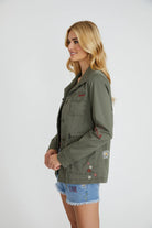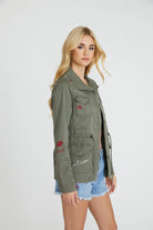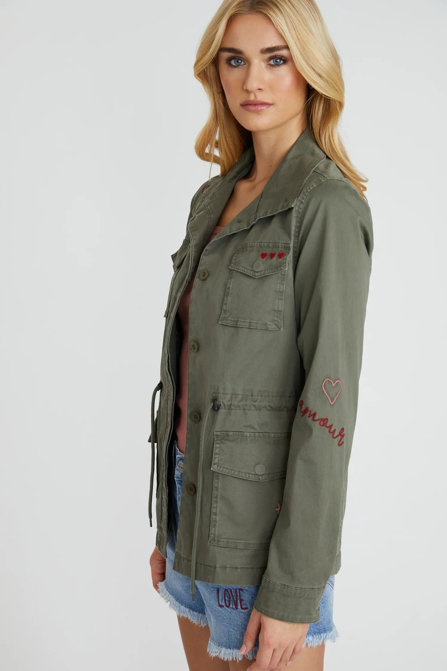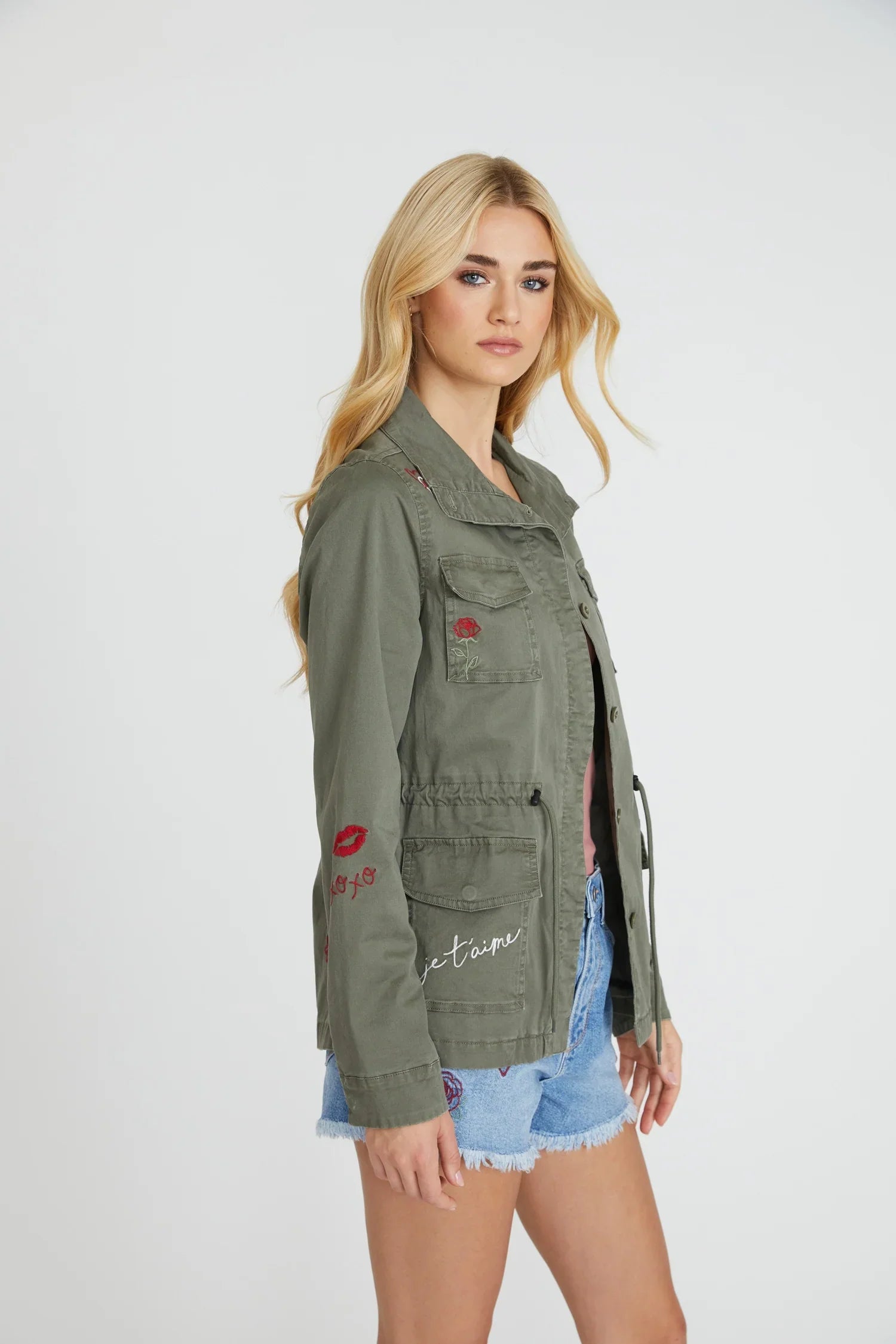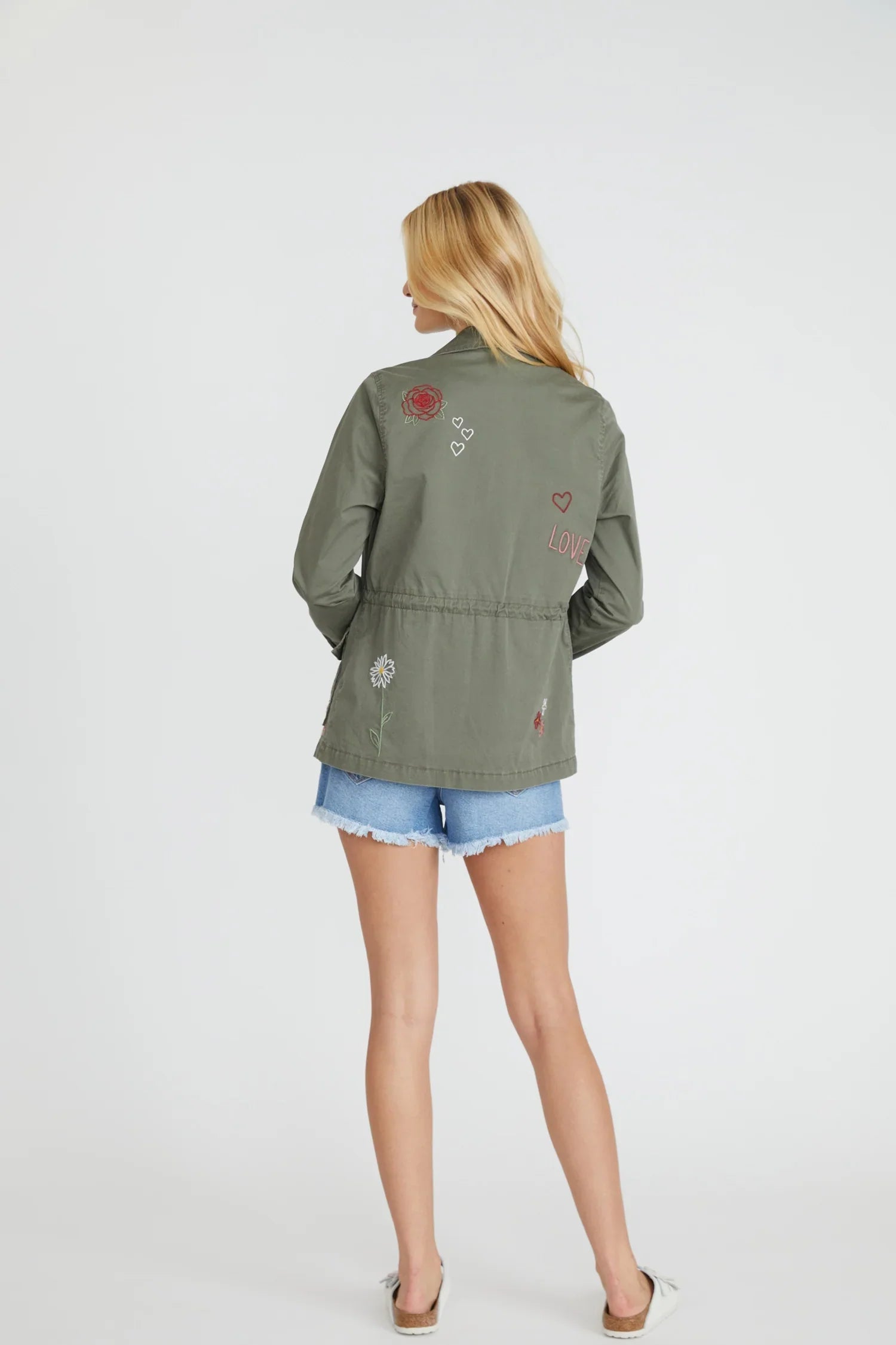 Add some love to your wardrobe with the Amber military jacket. With its relaxed fit and embroidered "love notes," this jacket is sure to make a statement. This jacket has a drawstring to sinch the waist and give it some extra flair!