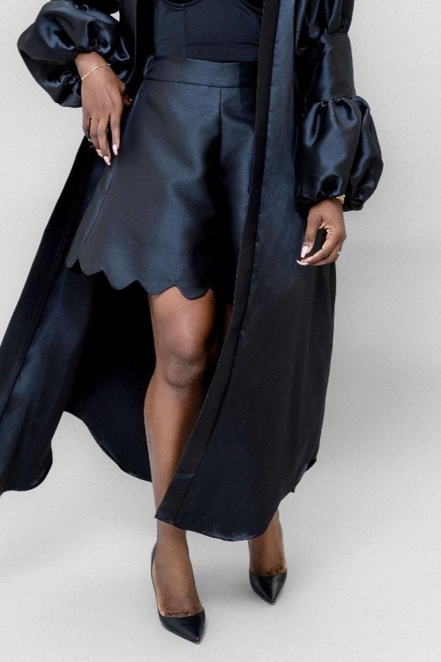 Unleash your sass with the Ebony Shorts! These dressy high waist black shorts feature a scalloped hem for a touch of elegance. Perfect for a night out or a casual day, these shorts will elevate any outfit. Get ready to turn heads and feel confident with the Ebony Shorts! For detailed measurements please refer to our size guide or email/Call - modchiccouture@gmail.com / 8329257491. You can also send us DM on IG or FB