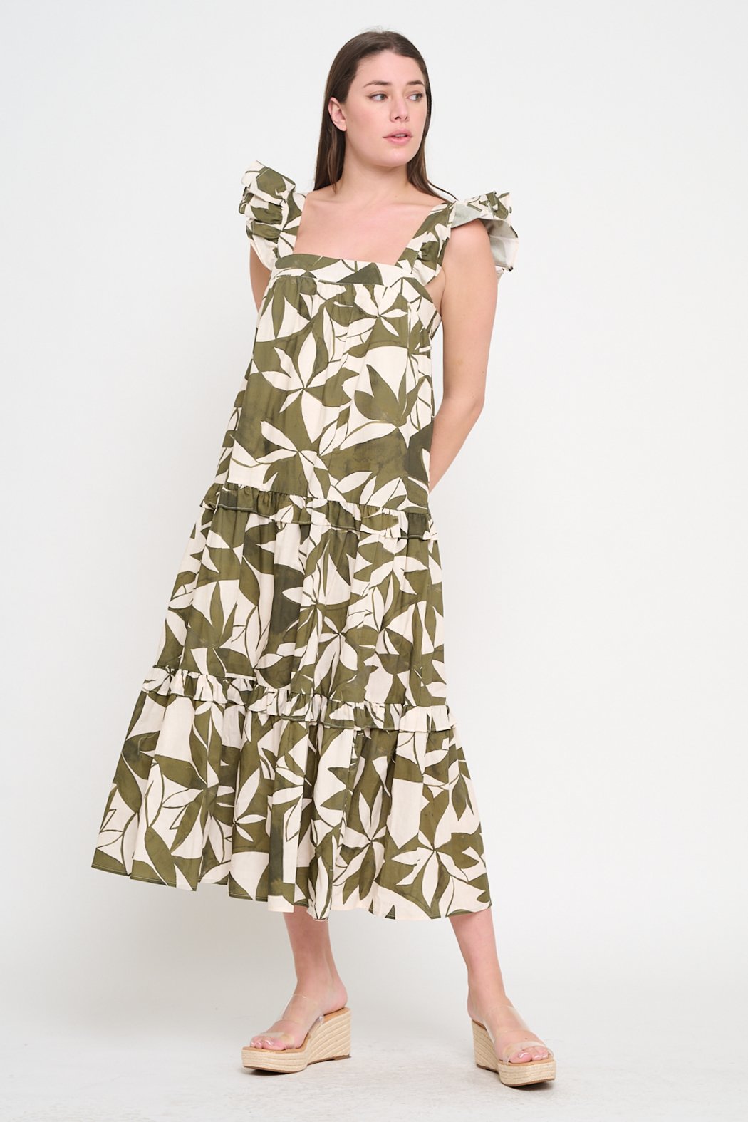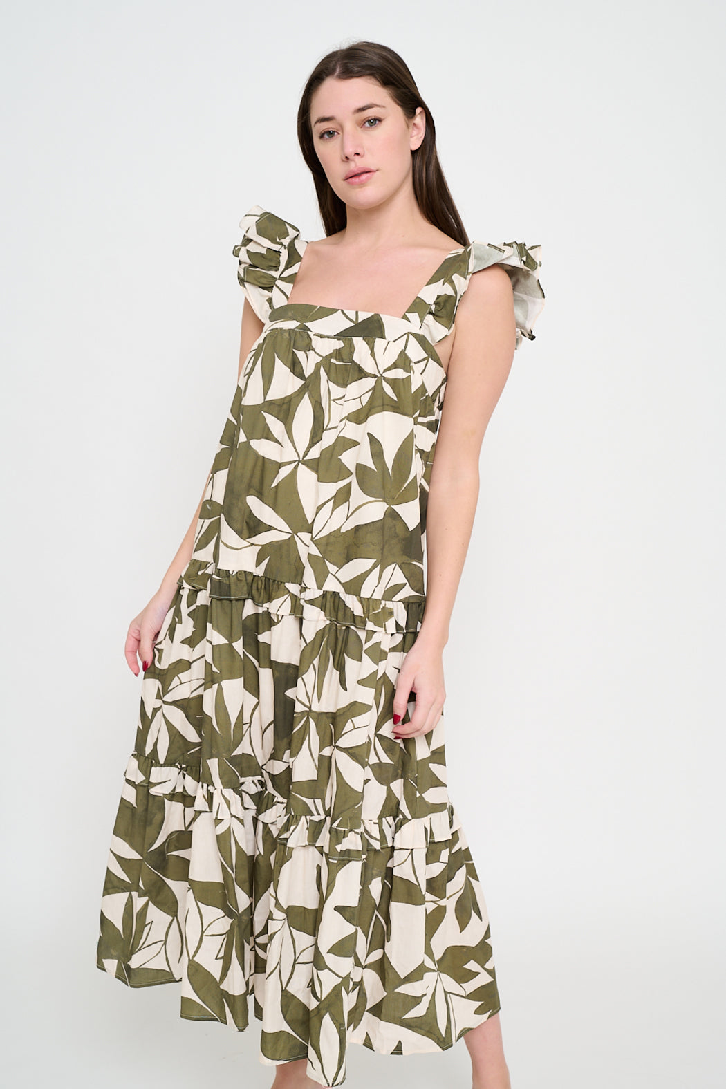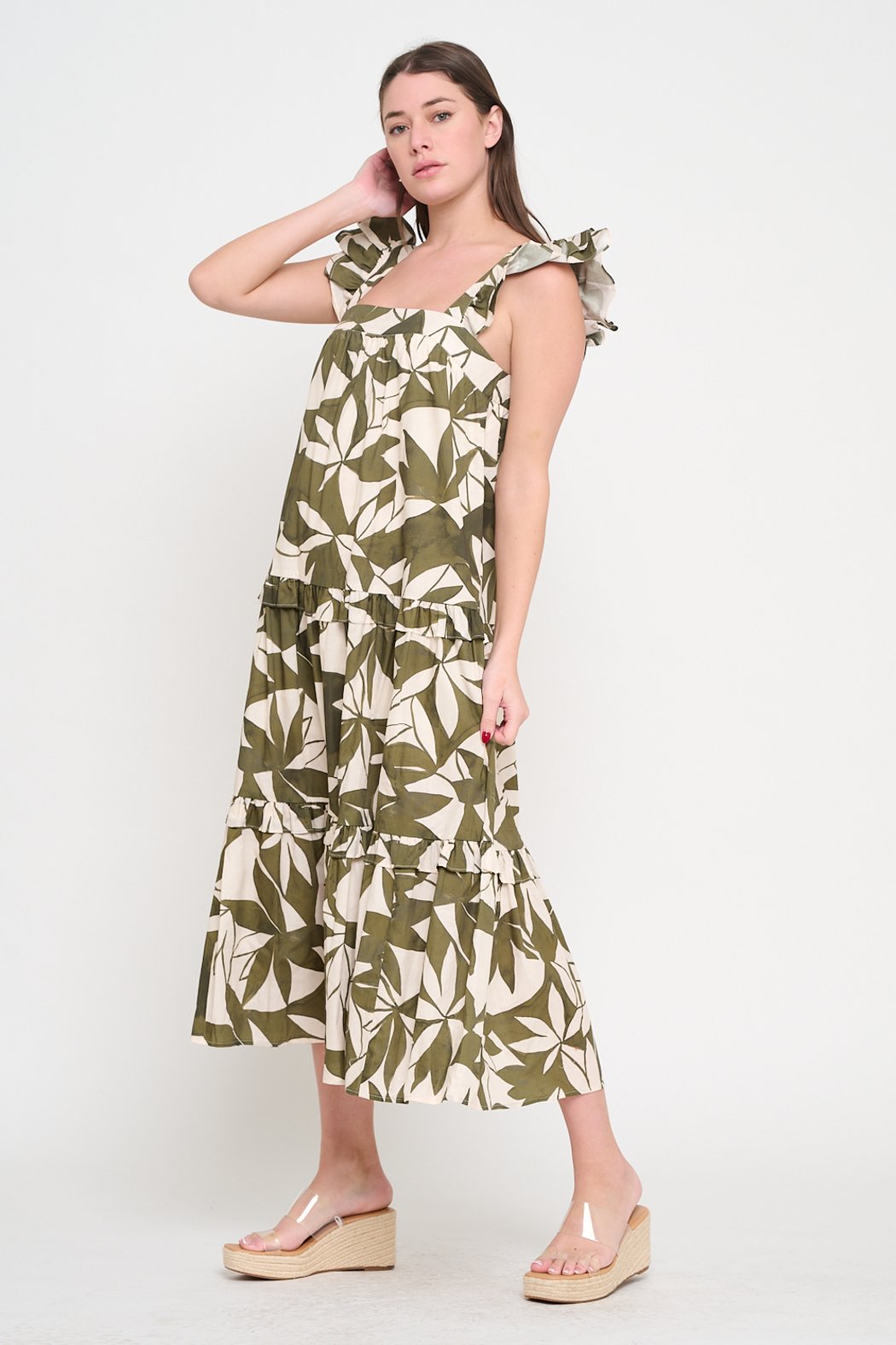 Step into effortless elegance with the Emerald Canopy Ruffle Maxi Dress, a breezy statement piece designed for sun-soaked days and balmy evenings. Crafted from soft woven fabric, this maxi features a lush, leaf-inspired print that channels the beauty of nature. The square neckline is framed by playful ruffle straps, while the tiered A-line silhouette flows gracefully with every step. Ideal for resort escapes, garden parties, or coastal getaways, it pairs perfectly with espadrille wedges or strappy flats. Lightweight and airy, it delivers both comfort and sophistication, making it your go-to dress for an elevated, vacation-ready look.