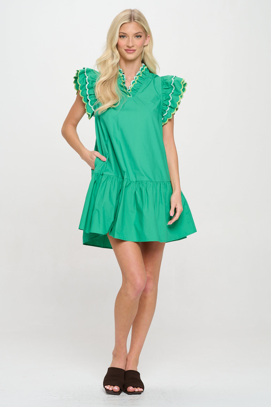 Fresh and bold like the hills above Santorini’s coastlines, the Emerald Oasis Scalloped Detailed Dress brings energy and charm to any warm-weather wardrobe. Featuring eye-catching scalloped trim along the ruffled sleeves and split neckline, this playful mini dress is cut from crisp, breathable cotton for an effortlessly polished finish. A tiered hem adds movement, while side pockets offer comfort and practicality. Whether you're wandering local markets, enjoying sunset cocktails, or heading out for a city stroll, this women’s vacation dress is a statement of joyful ease and feminine confidence.