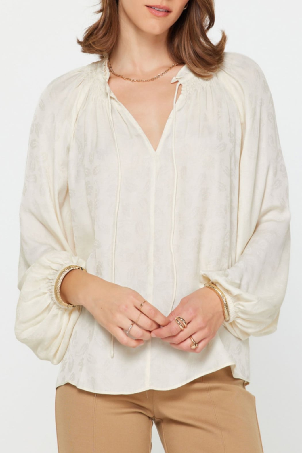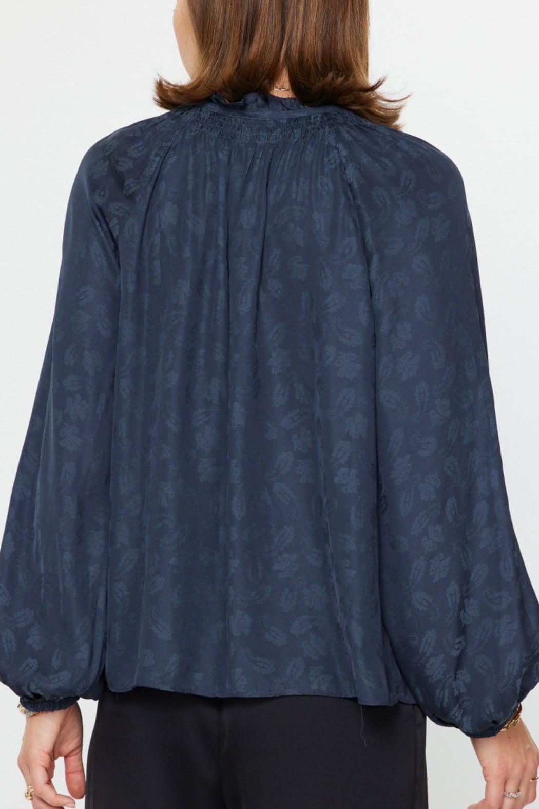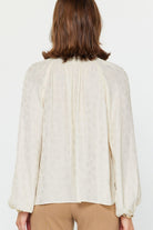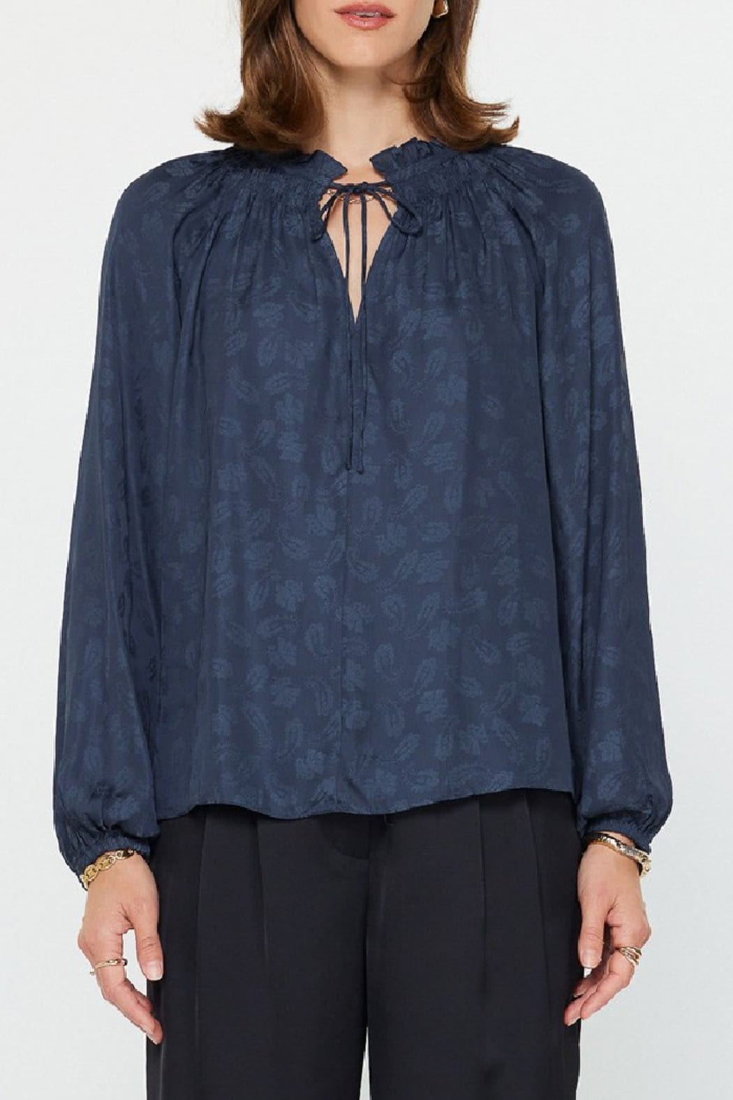 A flowing tie-neck blouse with a softly gathered yoke and long bishop sleeves for a relaxed, polished silhouette. The Current Air Long Sleeve Tie-Neck Blouse is cut from a lightweight, slightly textured fabric with a subtle all‑over motif and a keyhole tie at the neckline. Wear it tucked into tailored trousers for the office or with jeans for an elevated casual look. X-Small: 20" across chest, 24.5" shoulder to hem Small: 21" across chest, 25.75" shoulder to hem Medium: 22" across chest, 26" shoulder to hem Large: 23" across chest, 26.25" shoulder to hem Model is 5'8" wearing a small
