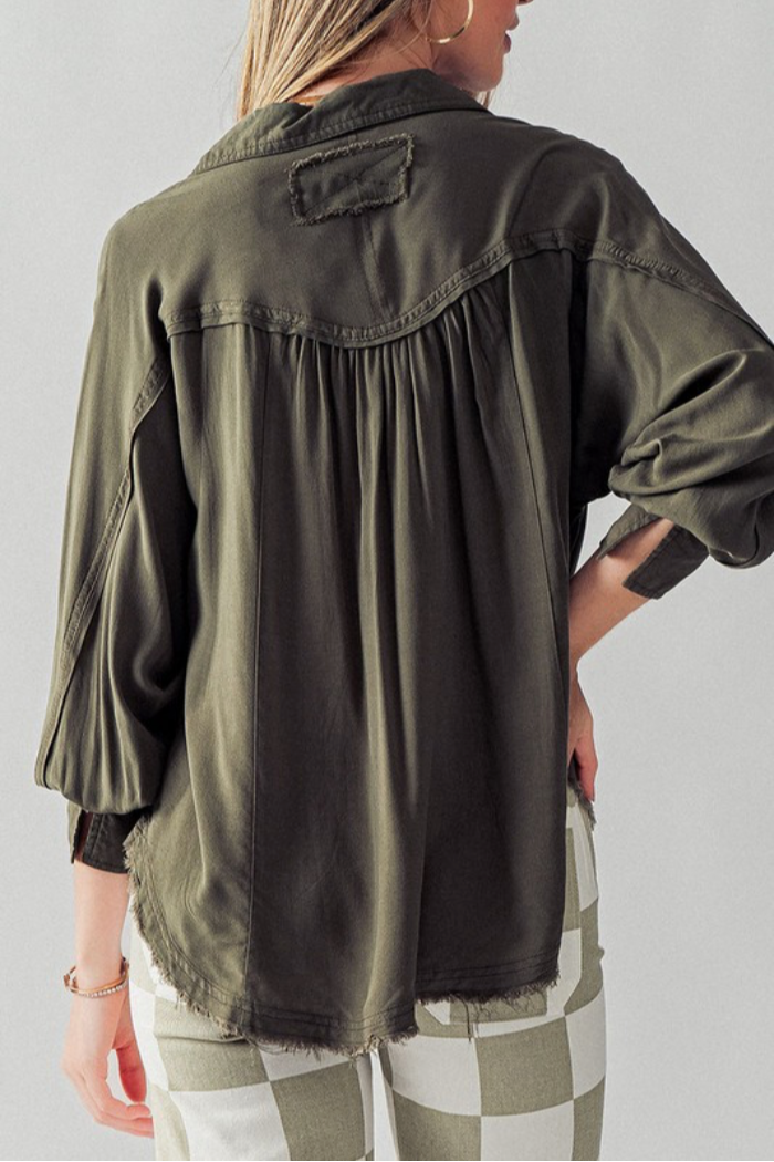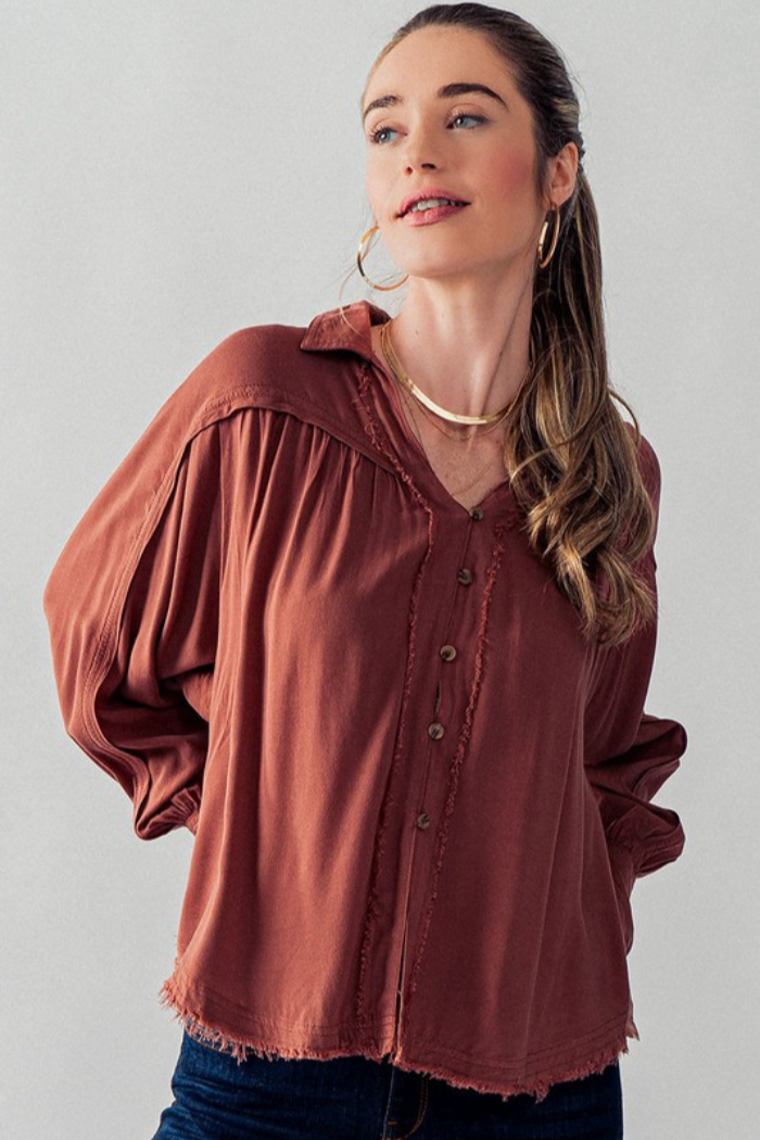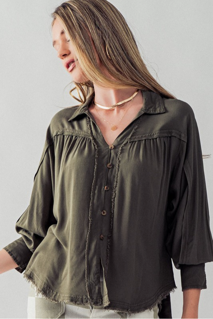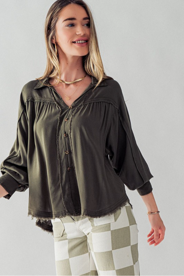 Long sleeve collared button down frayed hem top with frayed seam detail