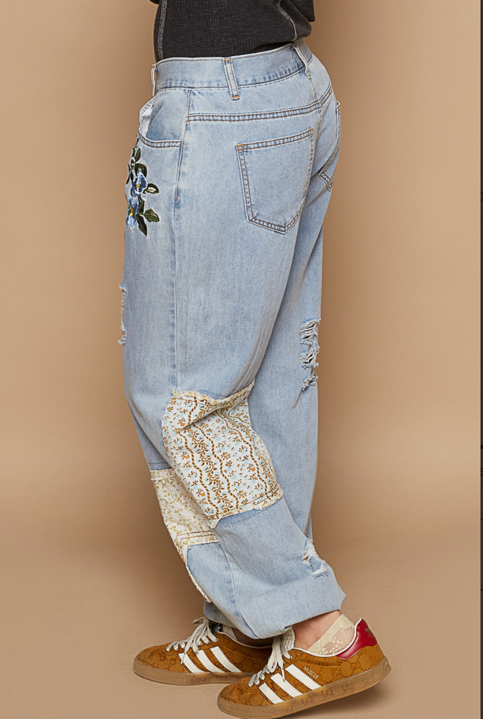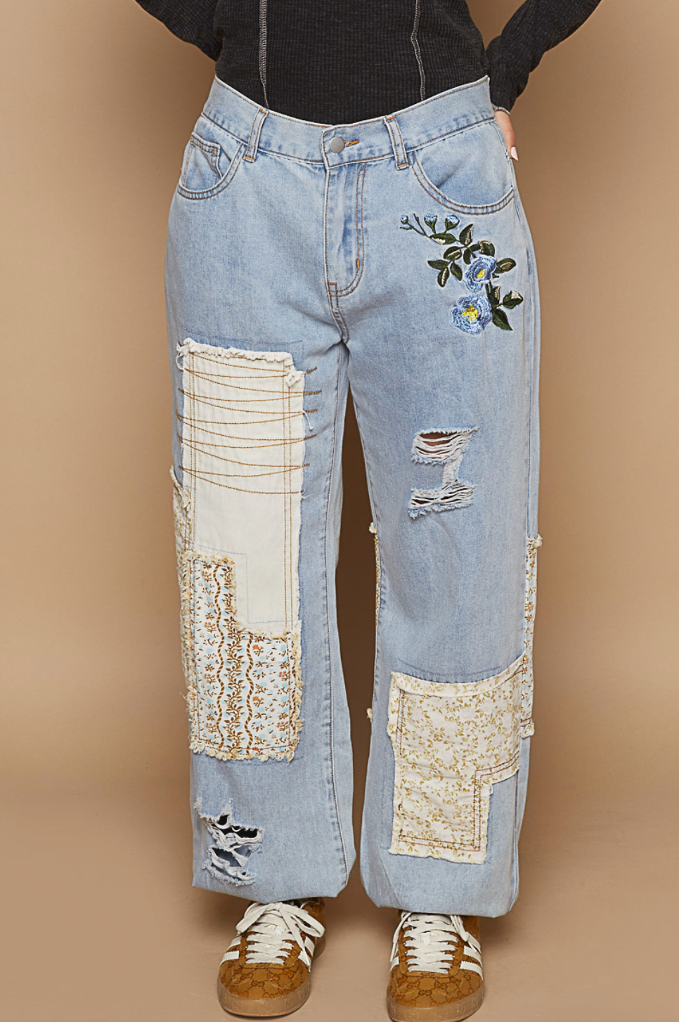 Designed in jogger pants, relaxed fit, embroidery, patchwork style, destressed detailing, featured in twill. 100% COTTON