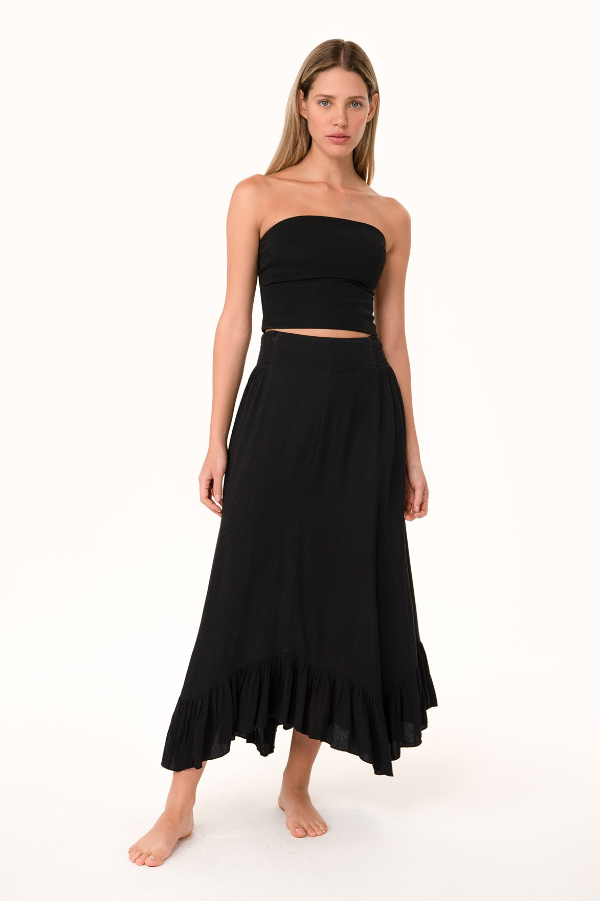 Flowy Smocked Ruffle Hem Skirt. A fun and flowy bohemian maxi skirt with a smocked side waist and ruffle hem. Pair this skirt with any causal top to achieve the ultimate Summer outfit. Fabric Contents 75% VISCOSE, 25% RAYON. Made in China