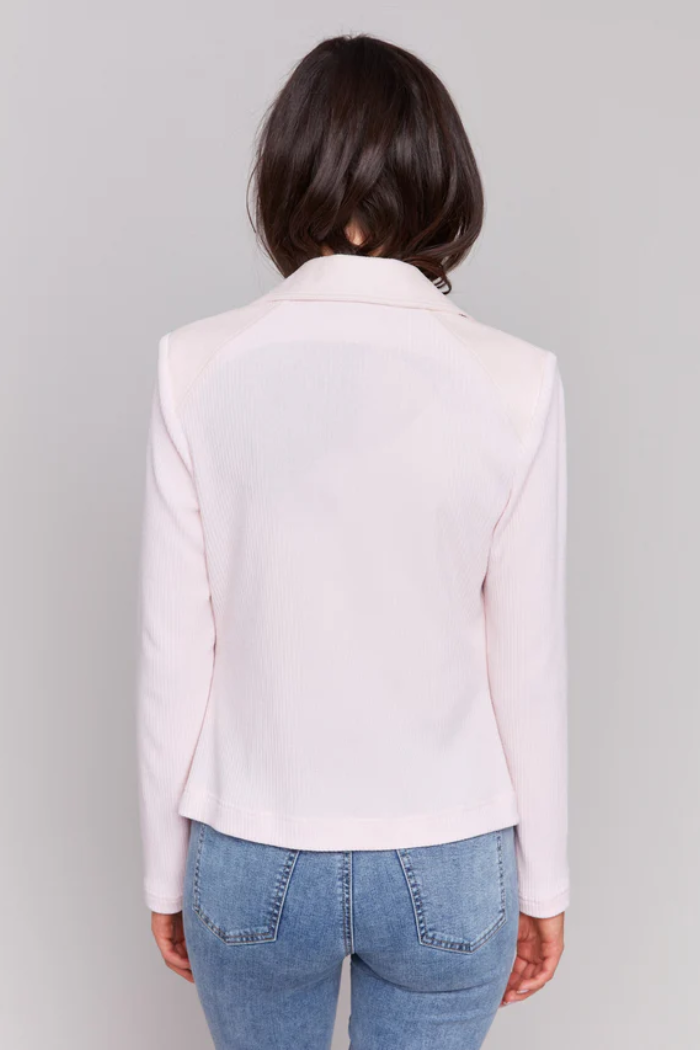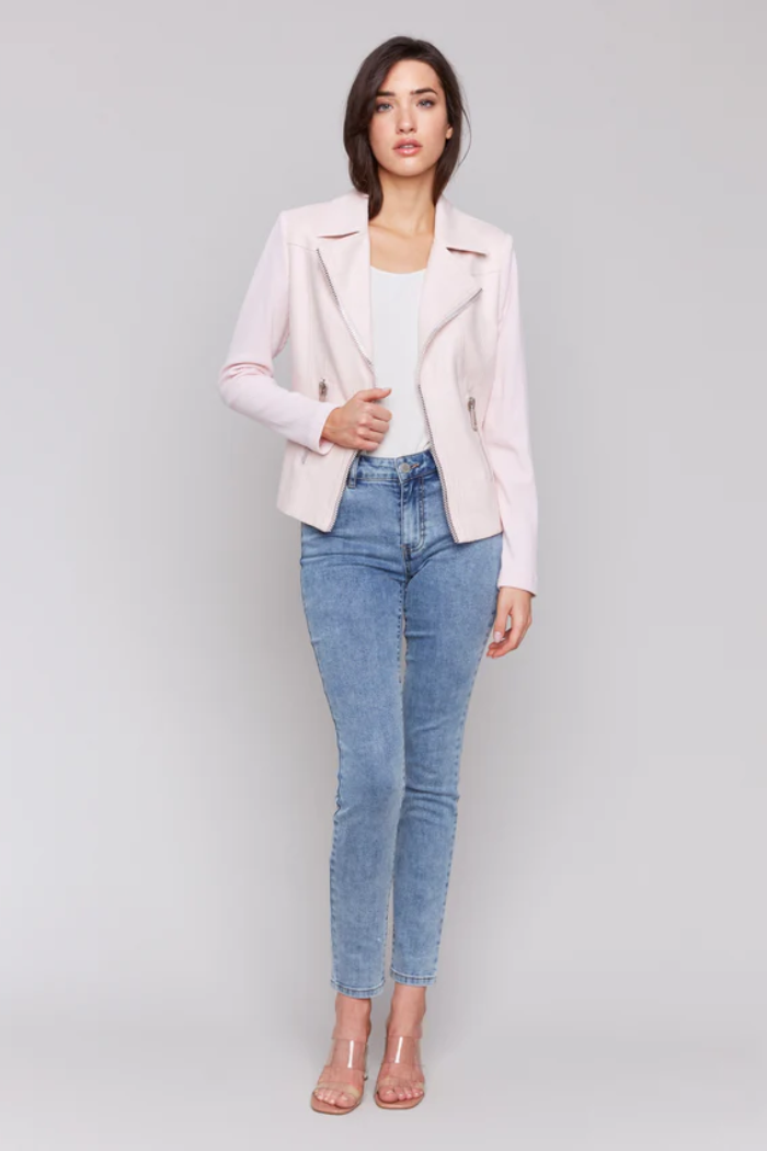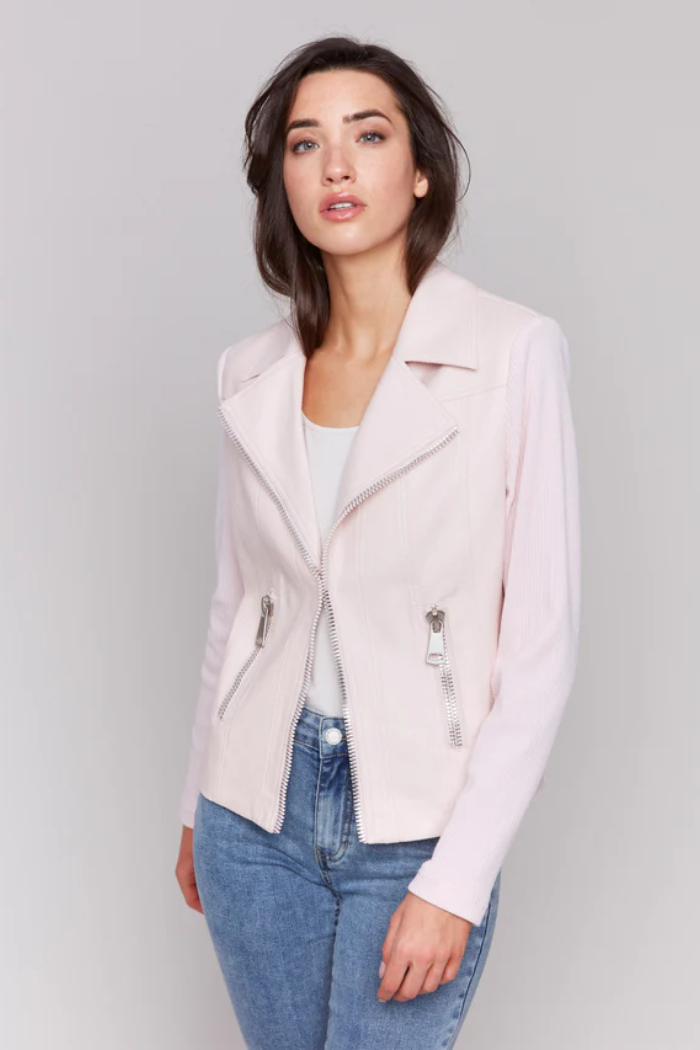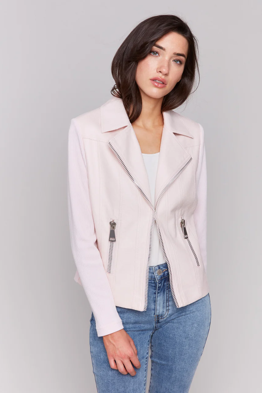 Step out in style this spring with the perfect blend of vintage-inspired faux leather and rib-knit fabric in this stunning jacket. The elegant petal pink hue adds a touch of sophistication, while the edgy faux pockets and zipper details create a unique flair.